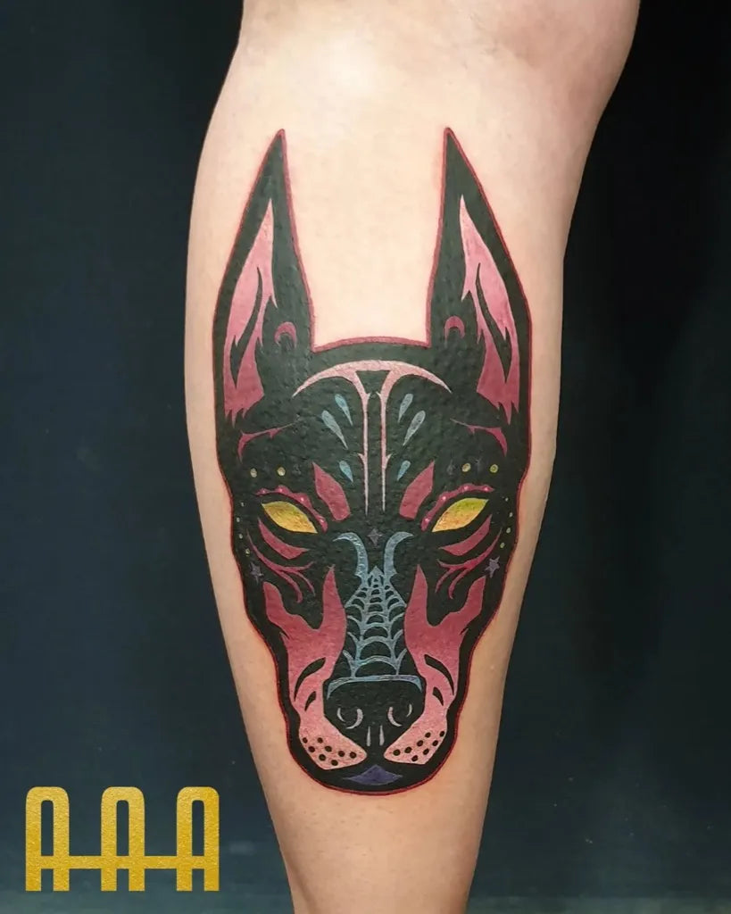 Big Neo Traditional Doberman Face Tattoo on Women Calf by @aykanaktastattoo