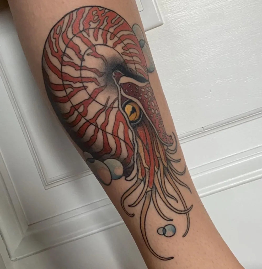 Big Traditional Nautilus Shell and Tentacles Tattoo on Women Calf by @aliciamarietattoo