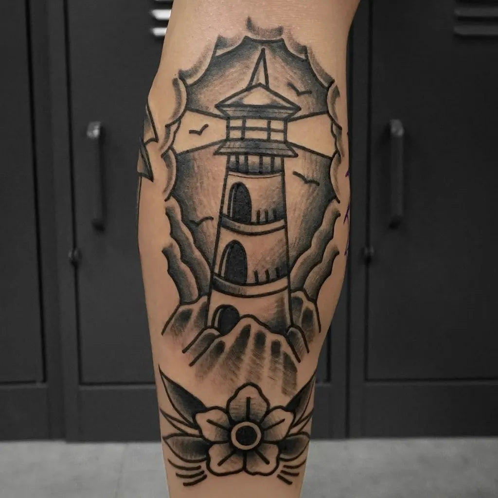 Medium American Traditional Lighthouse and Rose Tattoo on Men Calf by @tattooist_woody