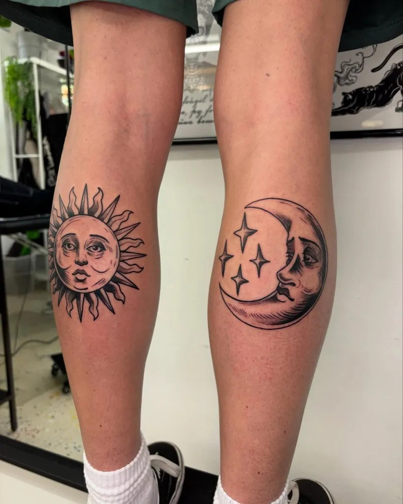 Medium Black and Grey Sun and Moon Tattoo on Women Calf by @taro_tat