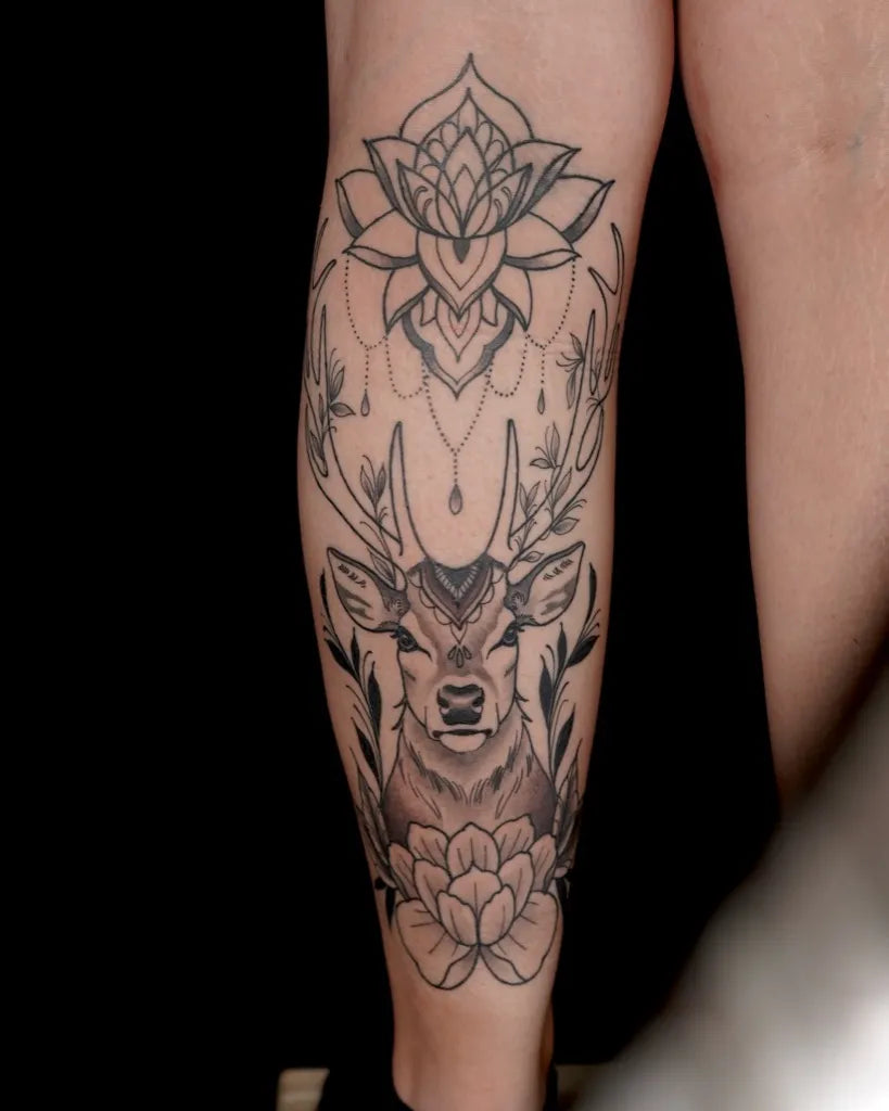 Medium Blackwork Deer and Mandala Tattoo on Women Calf by @undertheneedle_london