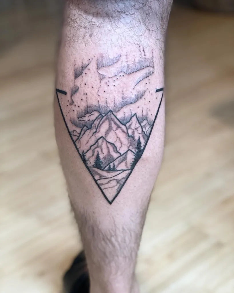 Medium Blackwork Mountain Aurora Tattoo on Men Calf by @killakay1
