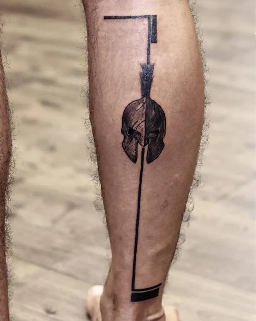 Medium Blackwork Spartan Helmet Arrow Tattoo on Men Calf by @shashank_pathak_tattoos