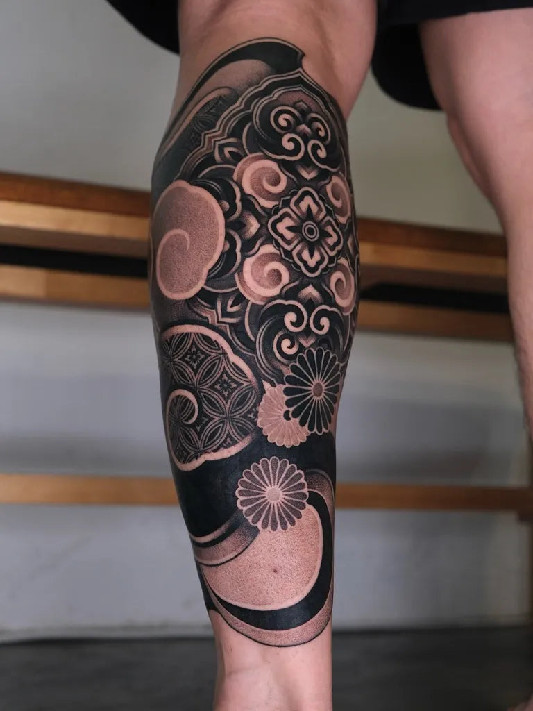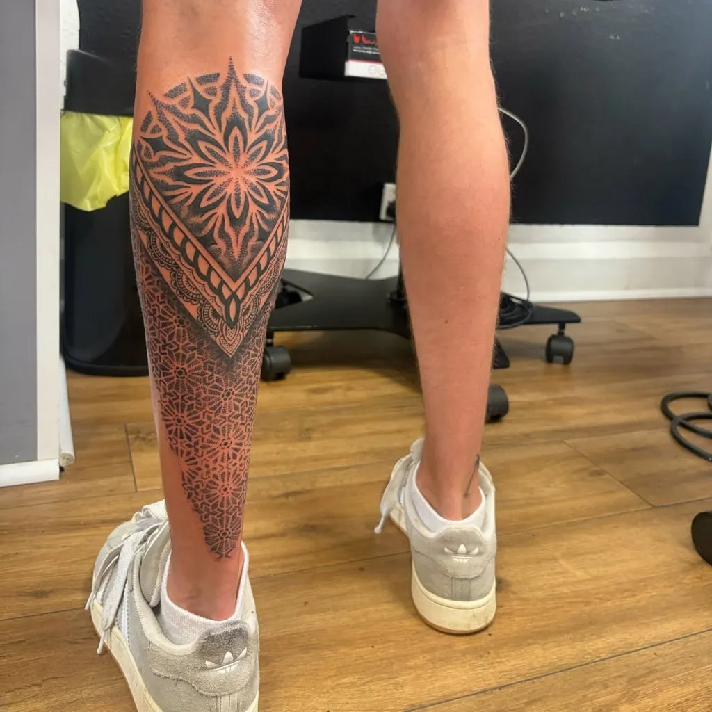 - Size and coverage: Wraparound calf tattoos that reach the knee pit or down toward the Achilles cross more sensitive zones.