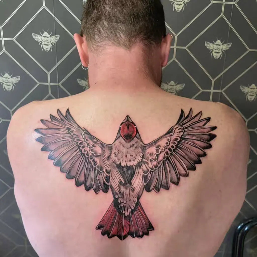 Big Black and Grey Cardinal Bird Tattoo on Men Back by @stung_tattoo