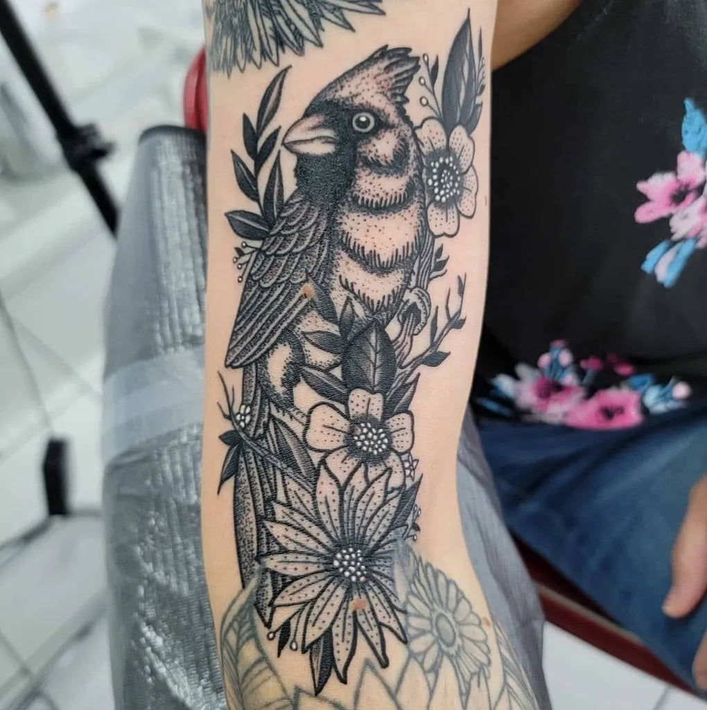 Big Black and Grey Cardinal and Flowers Tattoo on Women Arm by @tattoofiesta