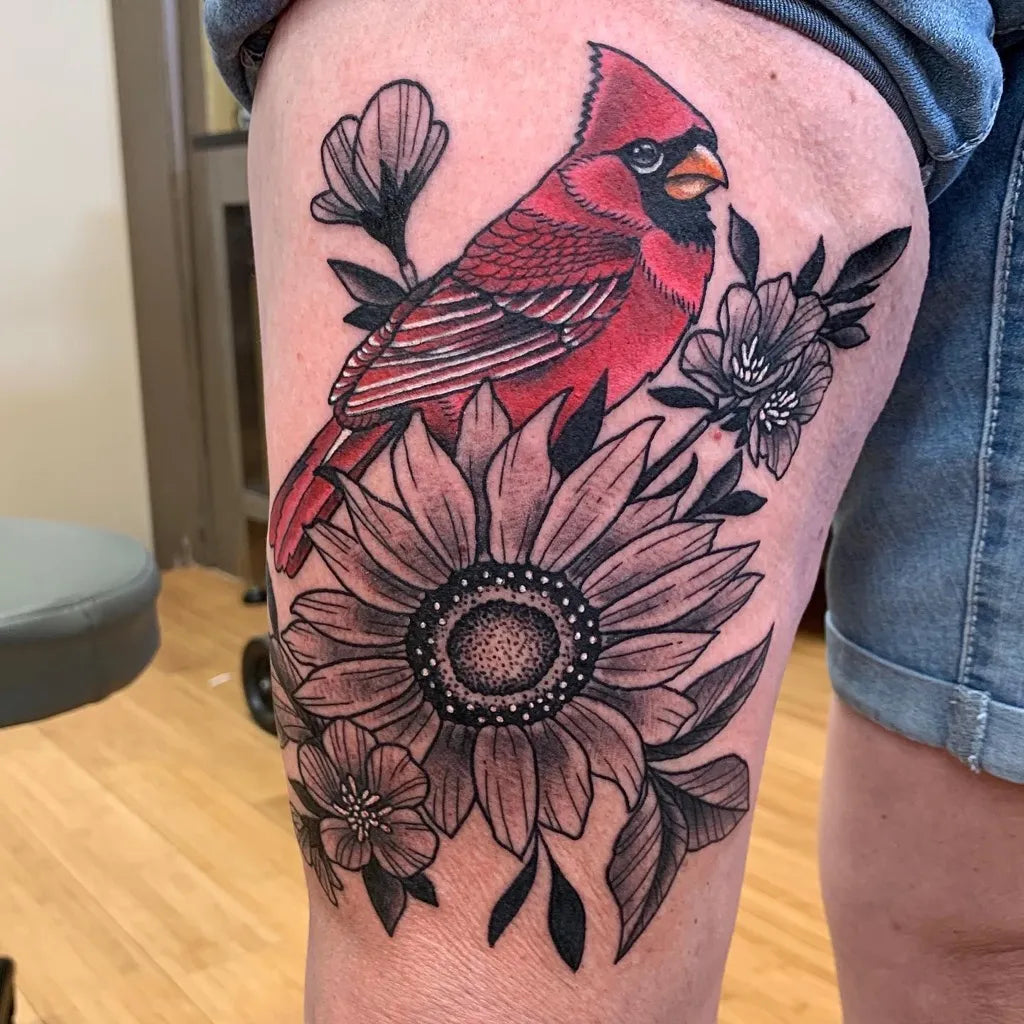 Medium American Traditional Cardinal and Sunflowers Tattoo on Women Thigh by @templetattooohio