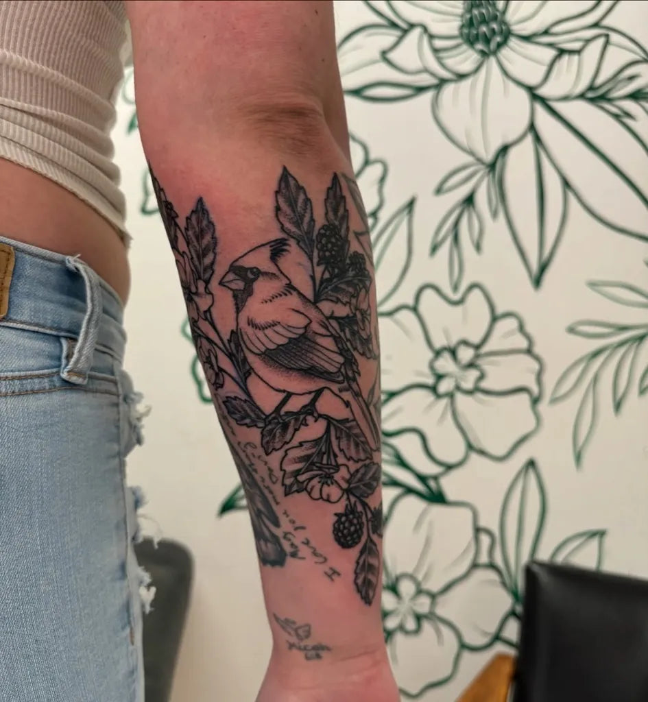 Medium Black and Grey Cardinal and Berries Tattoo on Women Arm by @fleetwood.kat.tattoo