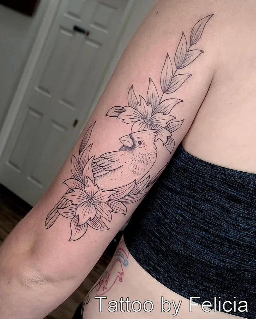 Medium Fine Line Cardinal Birdhouse and Flowers Tattoo on Women Upper Arm by @birdqueendesigns