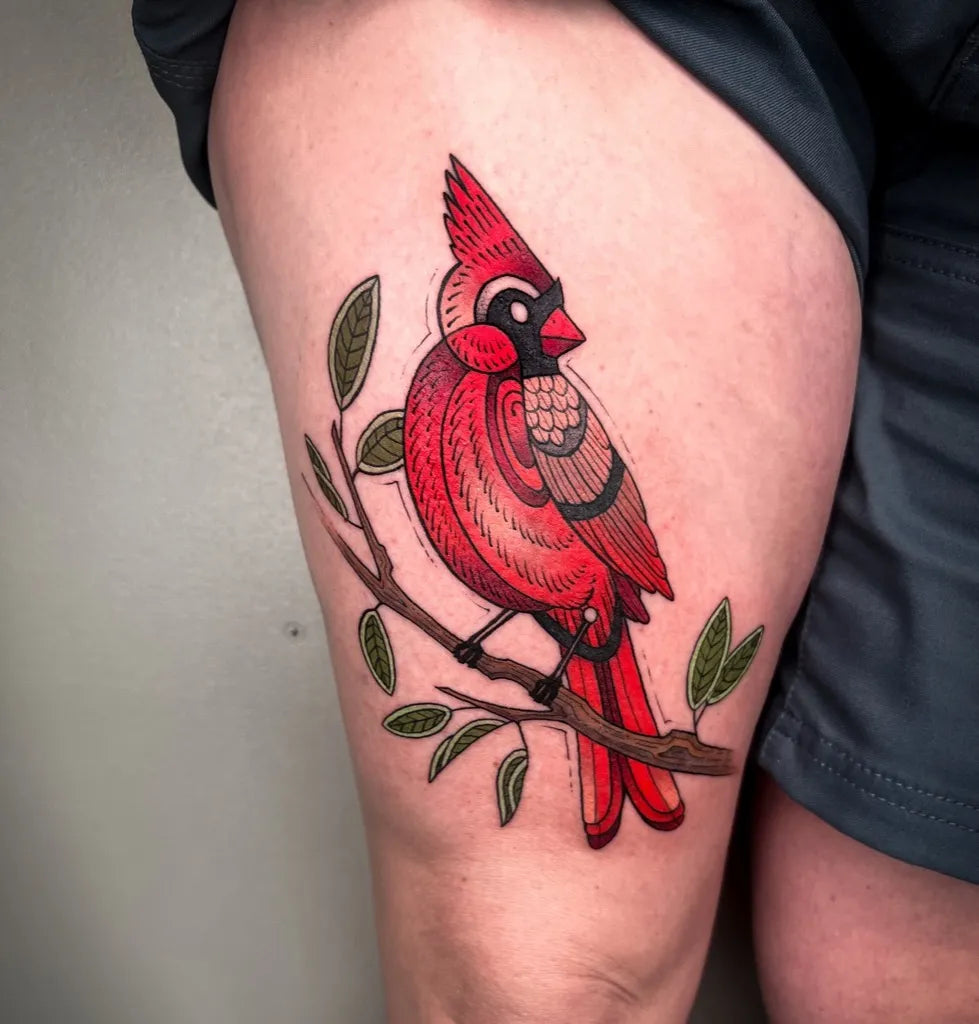 Medium Neo Traditional Cardinal Bird Tattoo on Women Thigh by @melaniesteinway