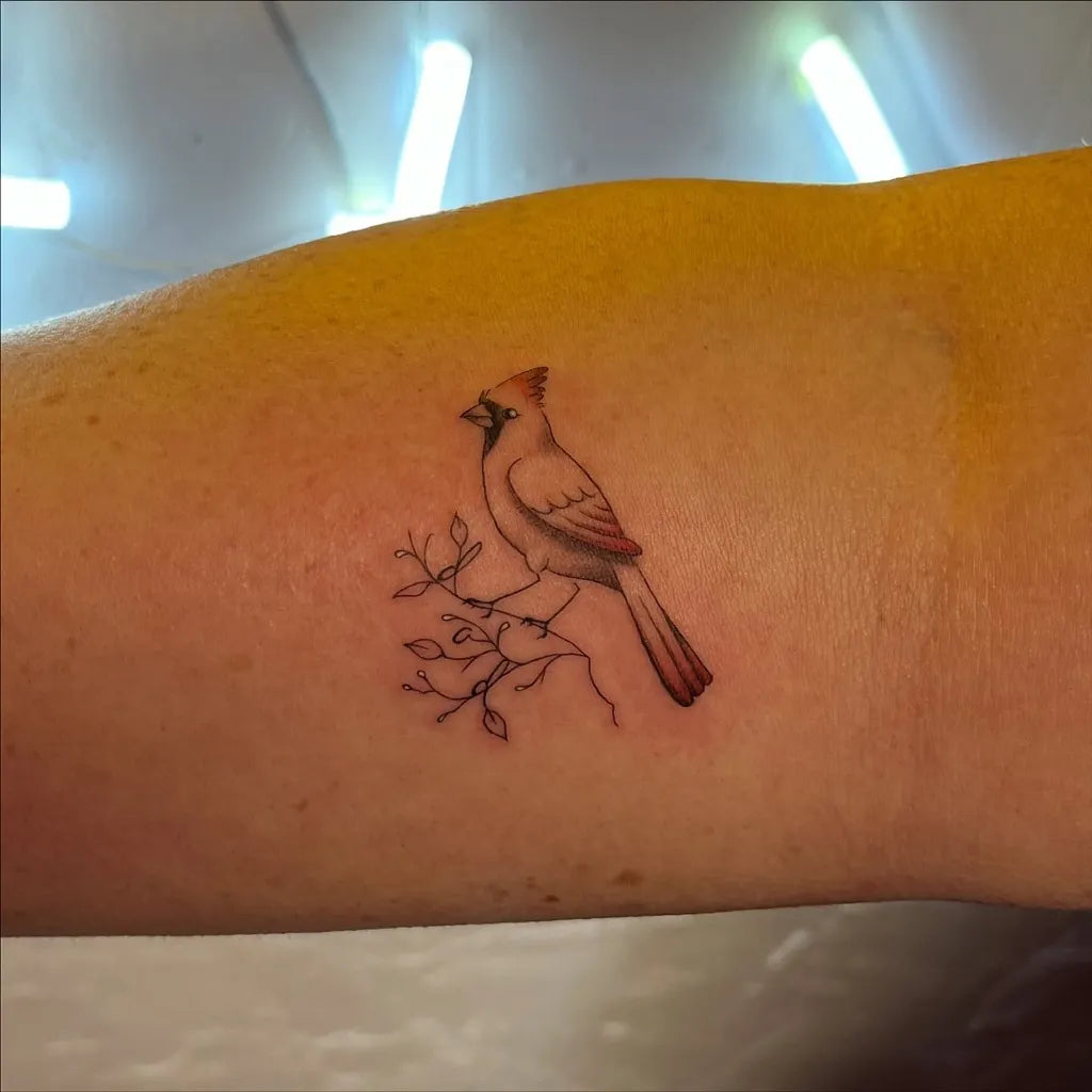 Small Realism Cardinal on Branch Tattoo on Women Arm by @themackisinsession
