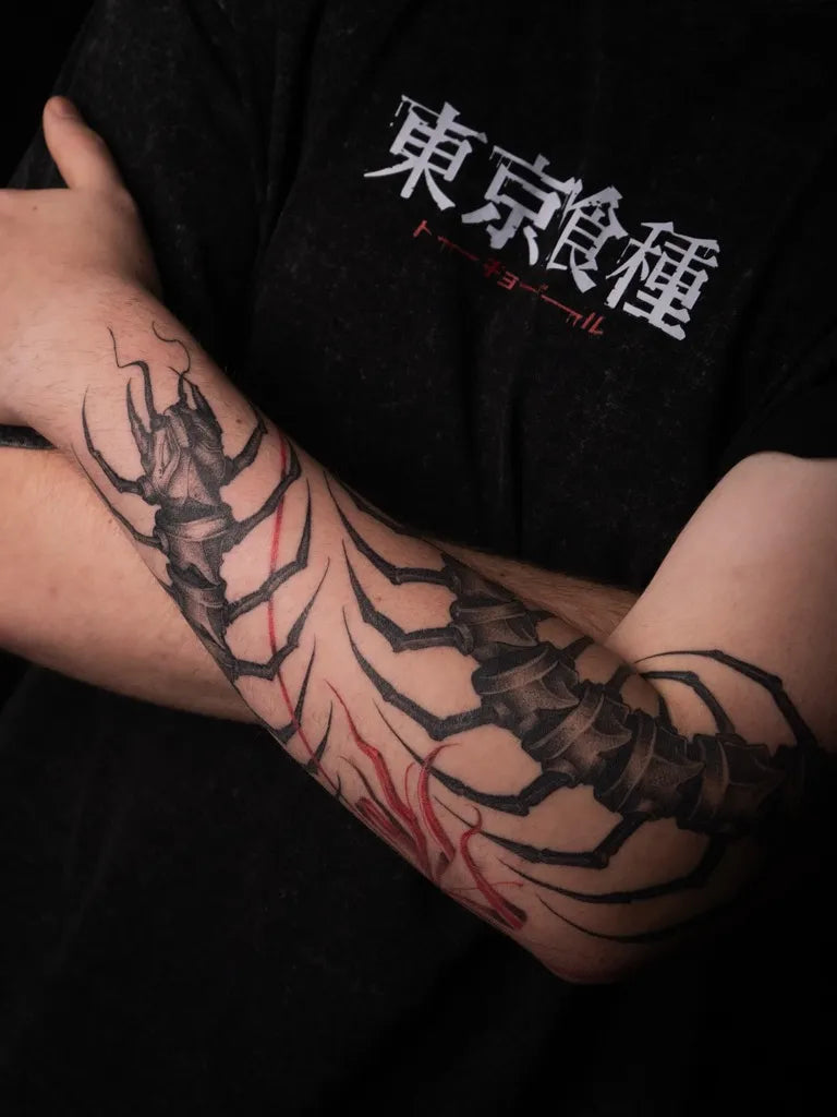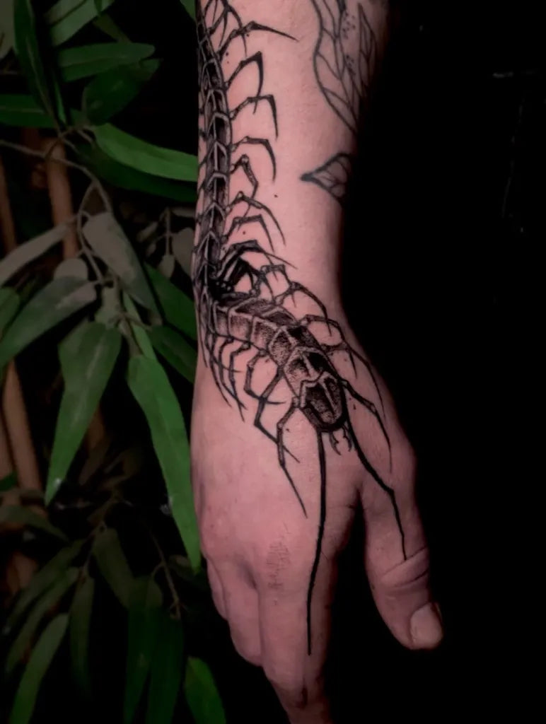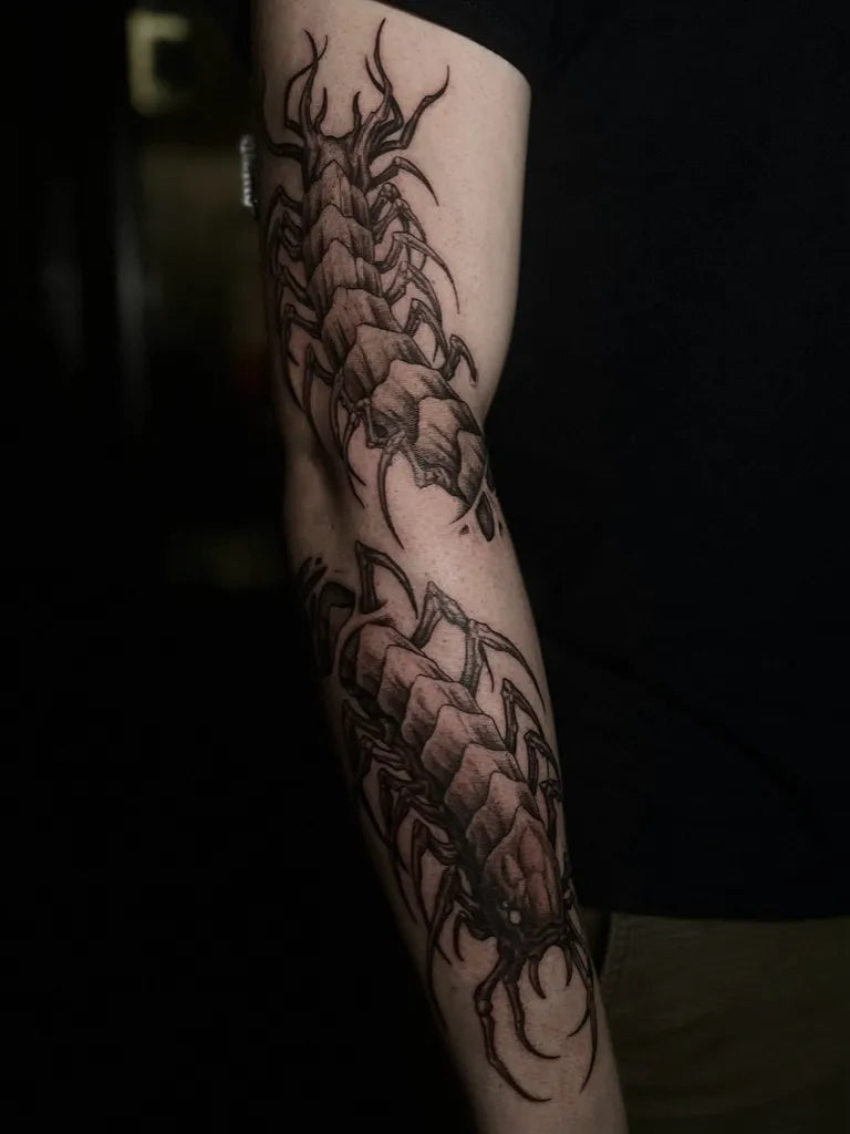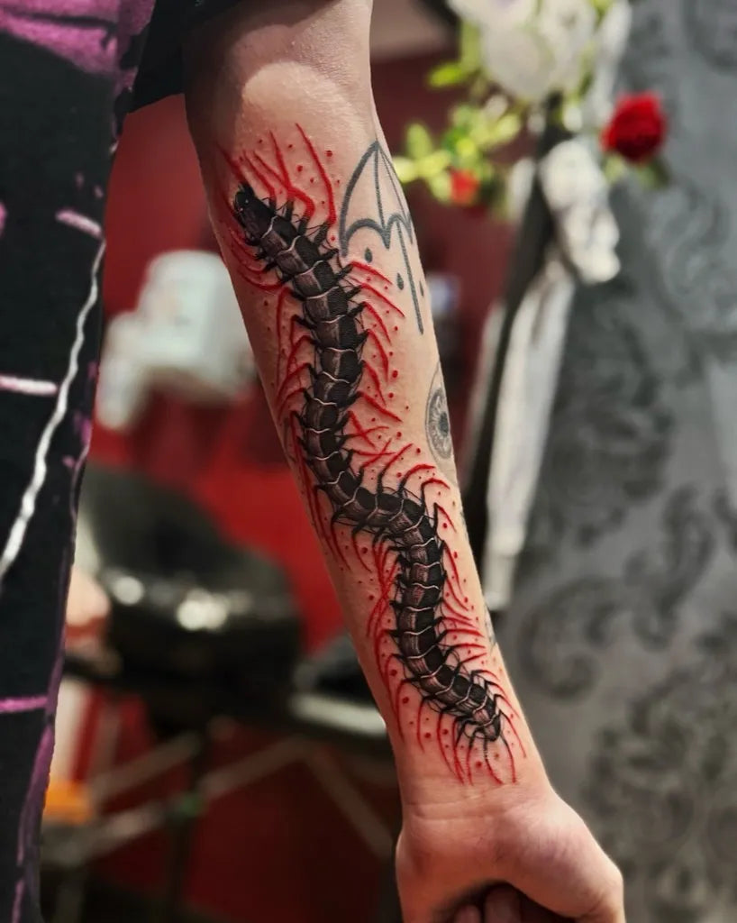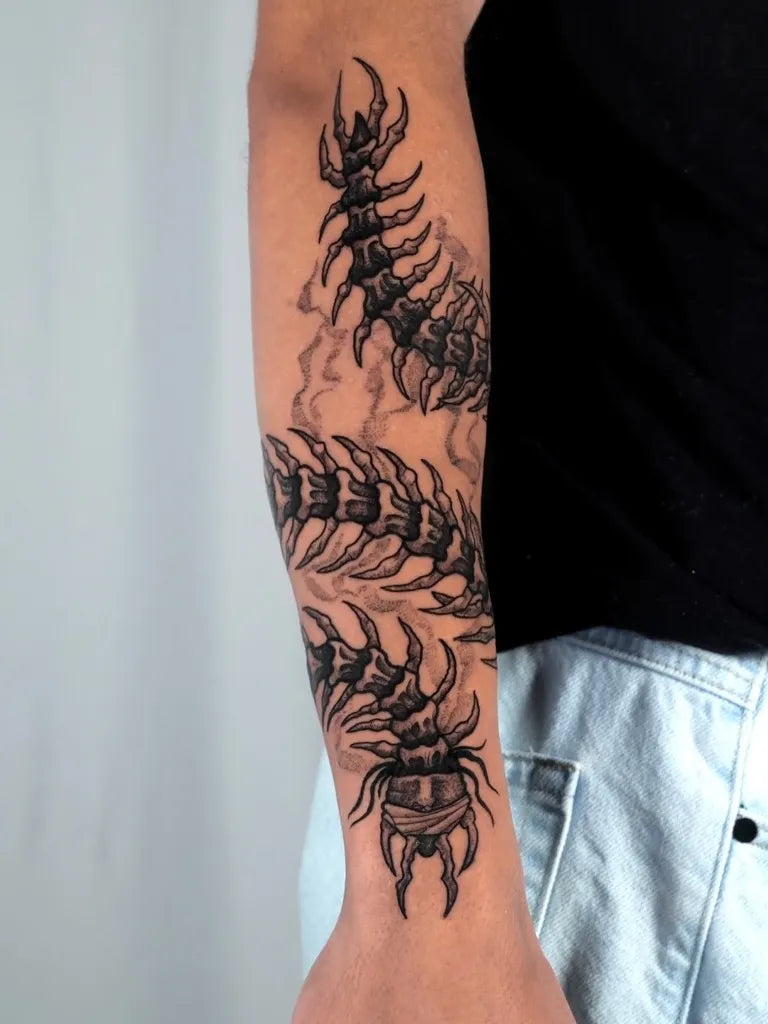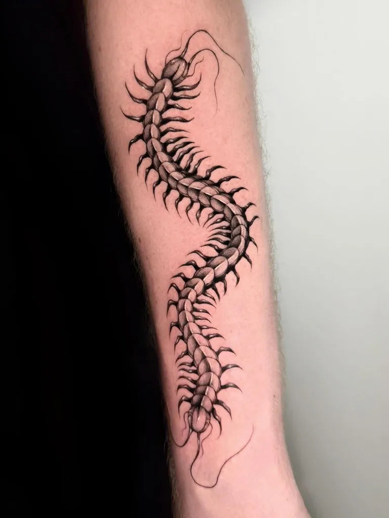 • Spine or forearm: The centipede’s natural curve flows beautifully along linear placements.