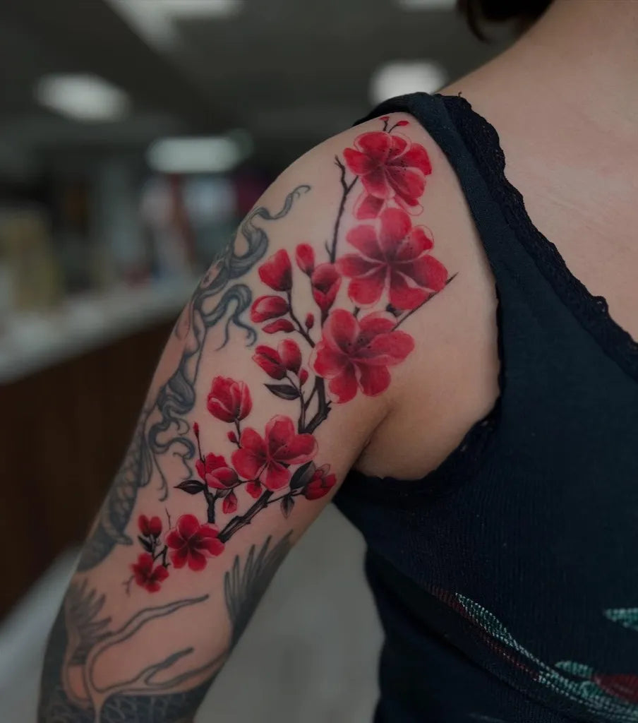 Medium Illustrative Cherry Blossom Branch on Women Shoulder Tattoo by @mumuoriental