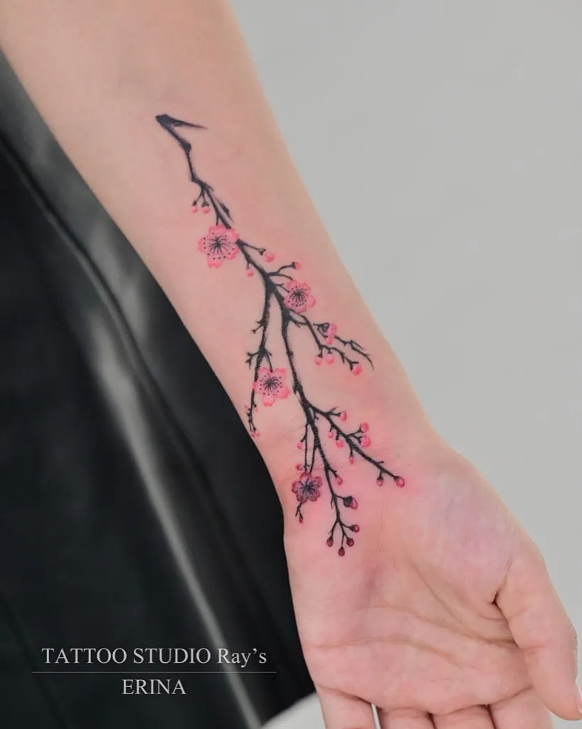 Medium Fine Line Cherry Blossom Branch on Women Arm Tattoo by @tattoostudiorays
