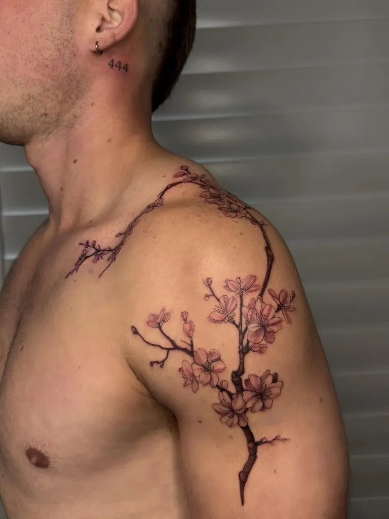 Medium Japanese Cherry Blossom on Men Shoulder Tattoo by @mytatpaige