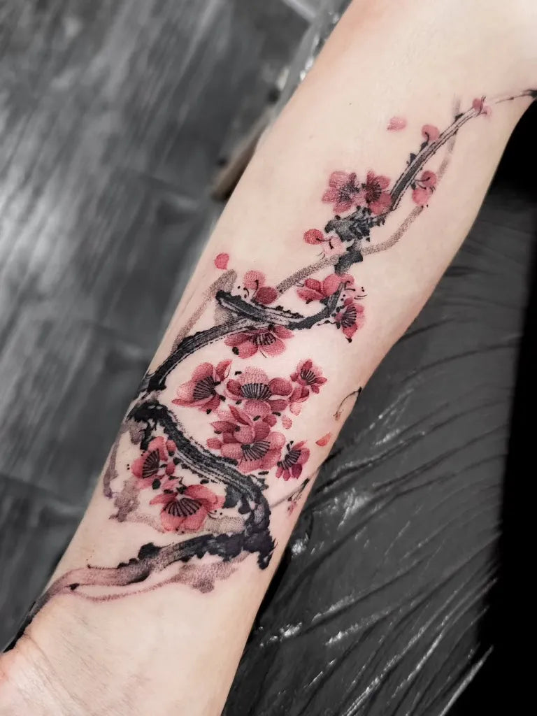 Medium Watercolor Cherry Blossom Branches on Women Arm Tattoo by @seoya_oriental