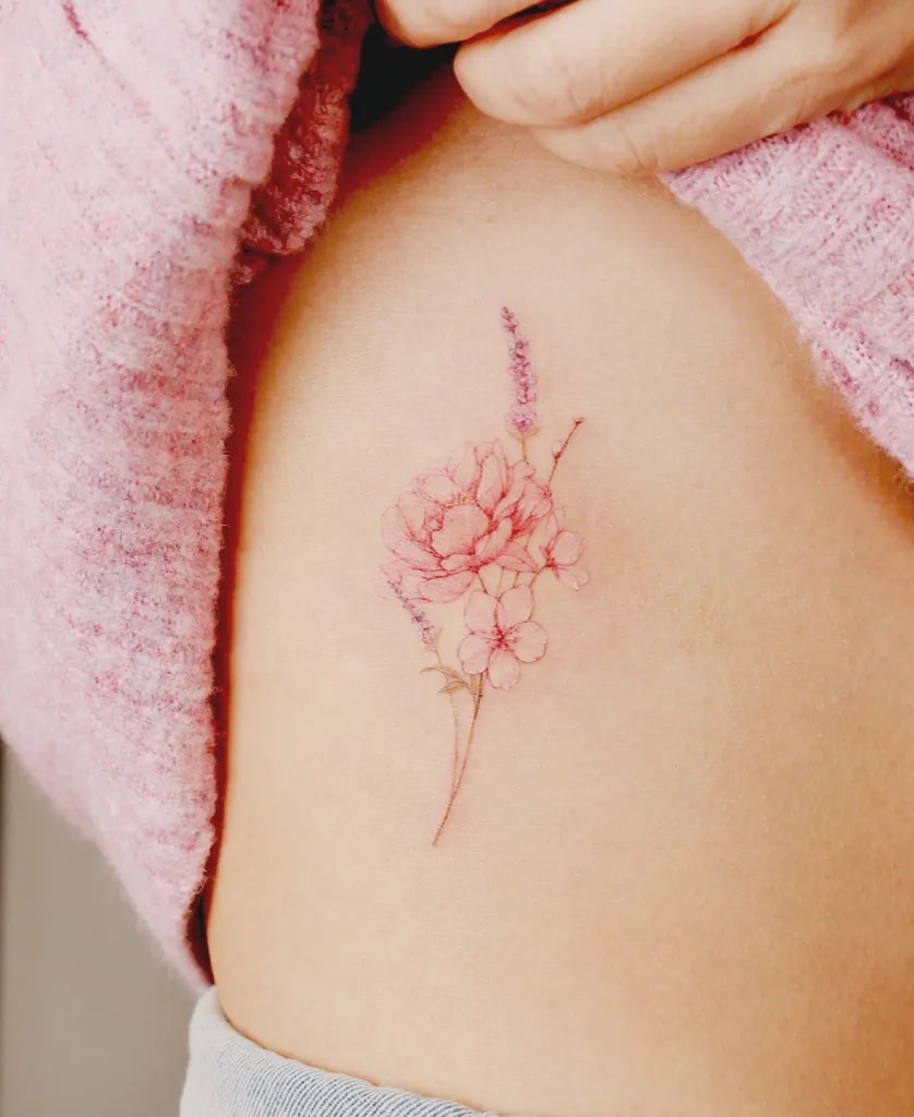 Small Fine Line Cherry Blossom and Lavender on Women Hip Tattoo by @tattooistflower_mood