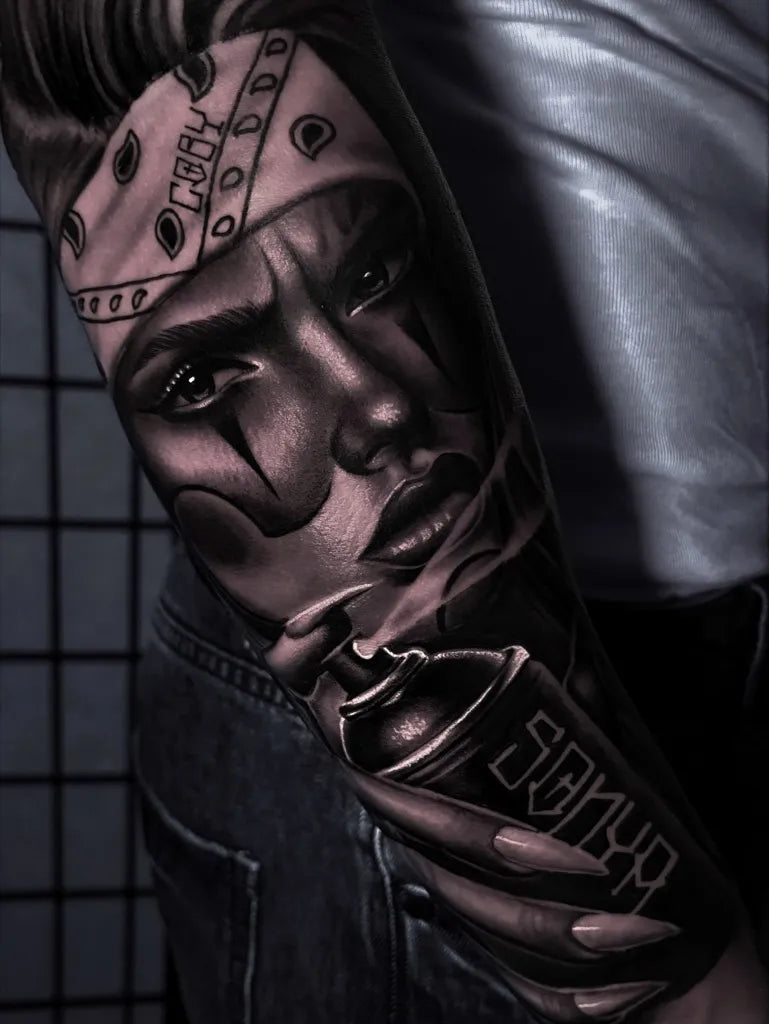 Big Chicano Woman with Clown Makeup Holding Money Tattoo on Women Arm by @octattoos__