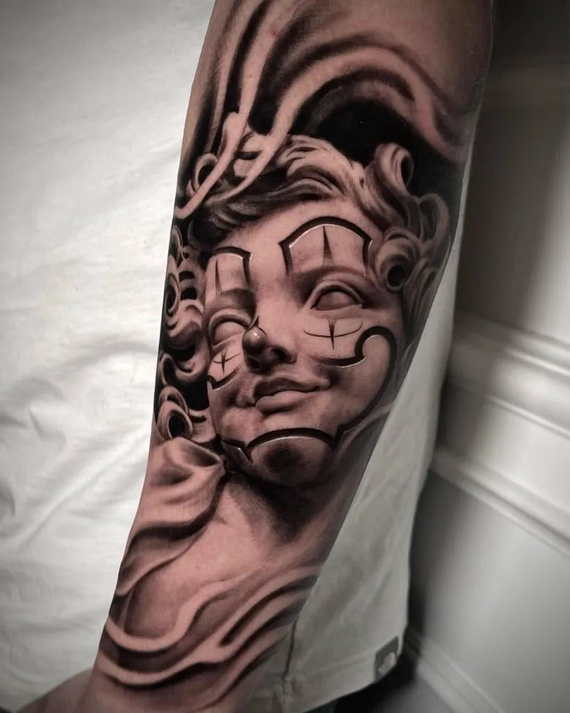 Medium Chicano Dual Theater Masks Tattoo on Women Arm by @amoreink_jf.tattoo