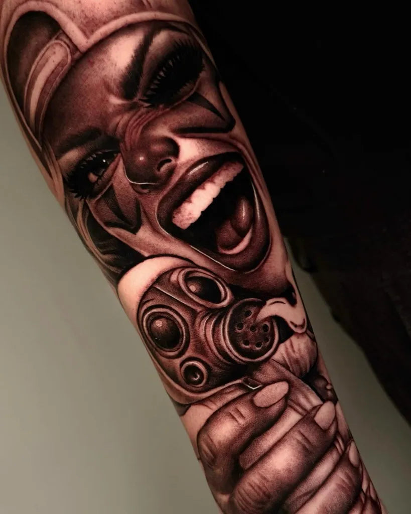 Big Chicano Clown Face Tattoo on Men Arm by @francescofrigenti_tats