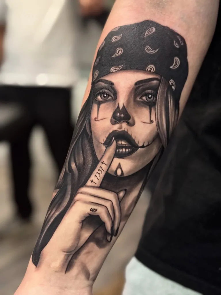 Big Chicano Woman with Bandana and Finger to Lips Tattoo on Women Arm by @vlad_msd