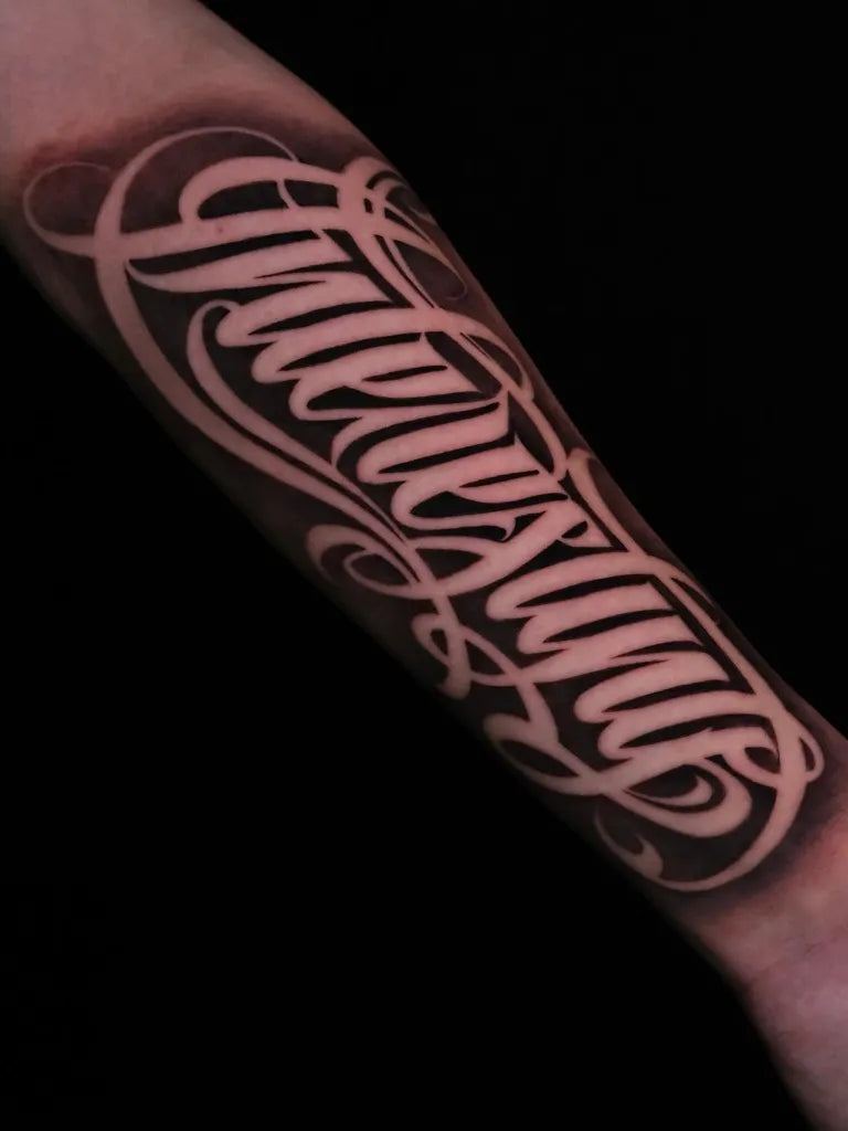 Medium Chicano Name Tattoo on Men Hand by @alexxbrandy
