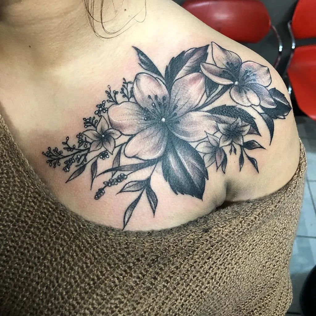 Medium Black and Grey Floral Bouquet Tattoo on Women Collarbone by @saldanastattoos