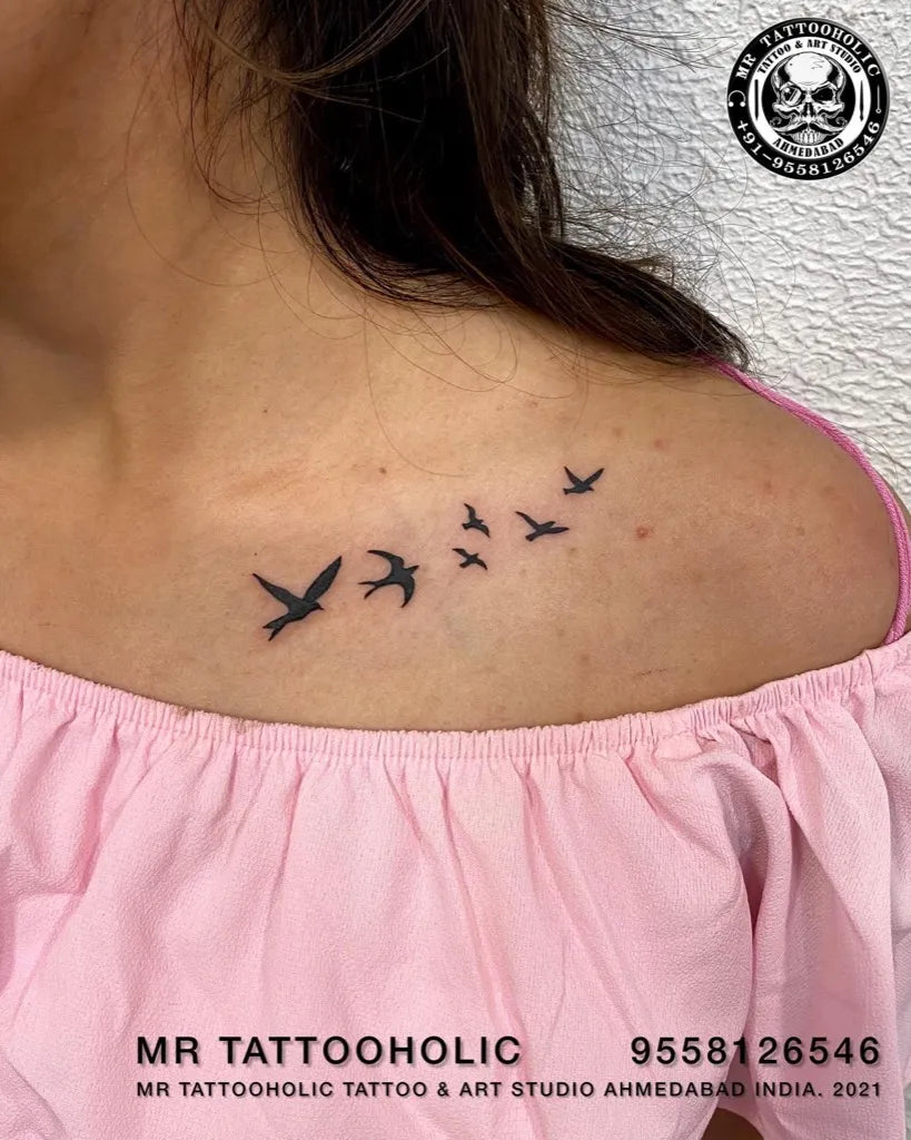 Small Blackwork Birds Tattoo on Women Collarbone by @mr_tattooholic_ahmedabad