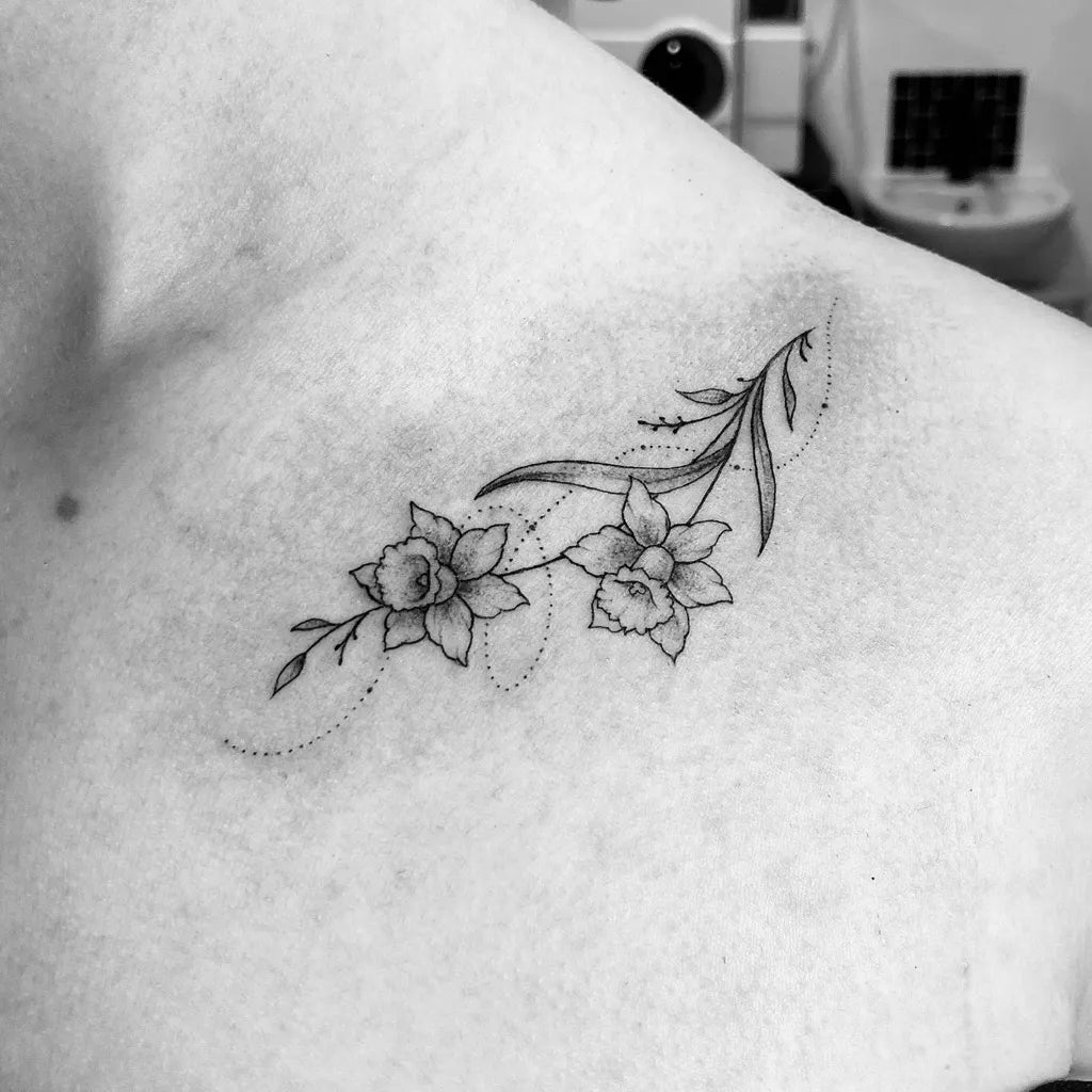 Small Fine Line Daffodils and Vines Tattoo on Women Collarbone by @jesskaiatattoo