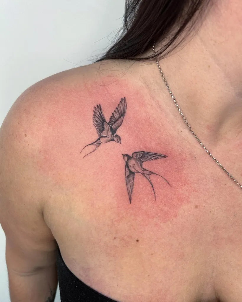 Small Fine Line Two Swallows Tattoo on Women Collarbone by @lucybethantattoos