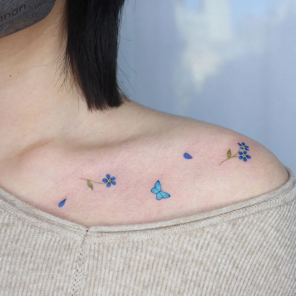 Tiny Fine Line Blue Flowers and Butterfly Tattoo on Women Collarbone by @bay__tattoo