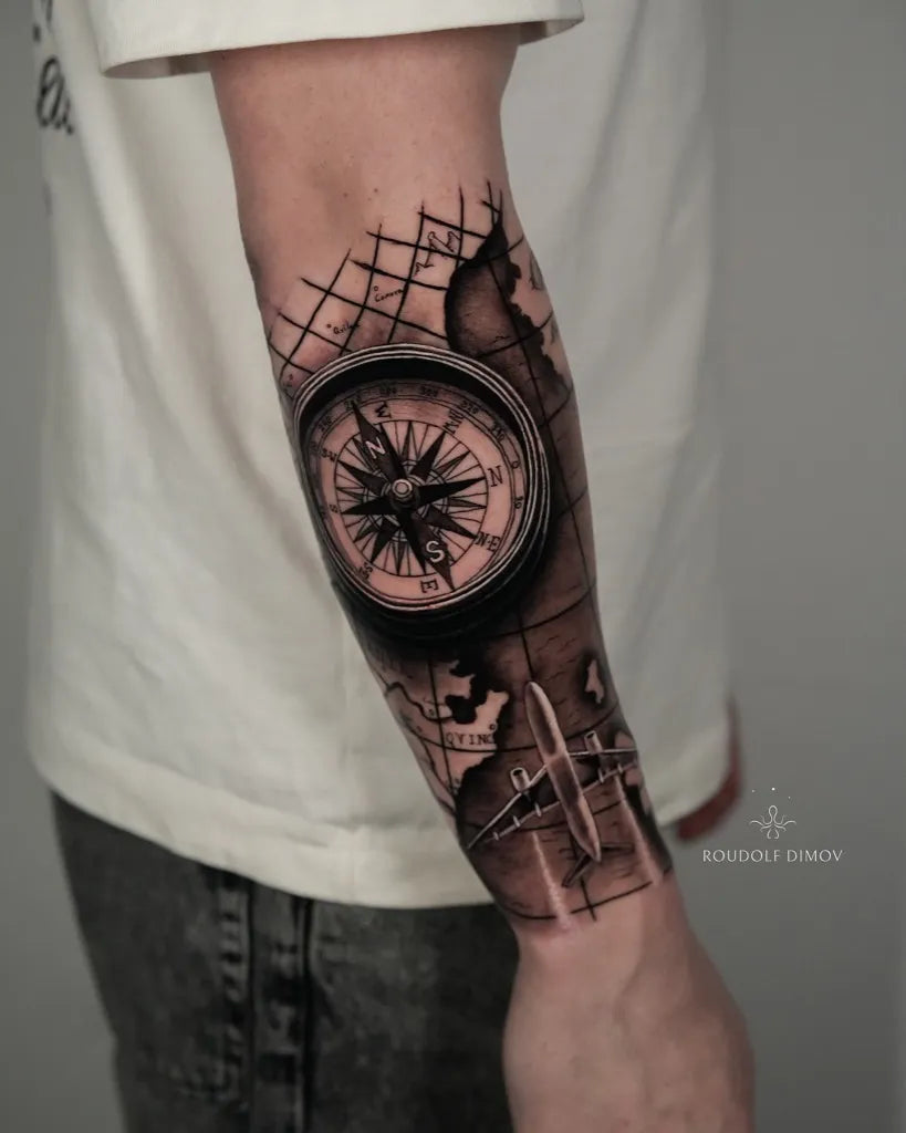 Big Black and Grey Compass Map Airplane on Men Arm Tattoo by @roudolfdimovtattoos