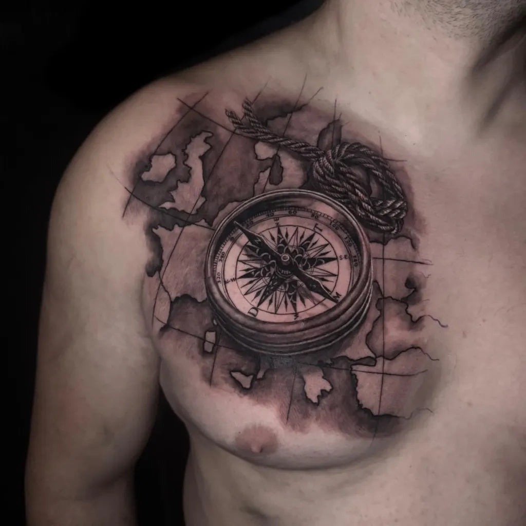 Big Black and Grey Compass Map Rope on Men Chest Tattoo by @redemptiontattoostudios