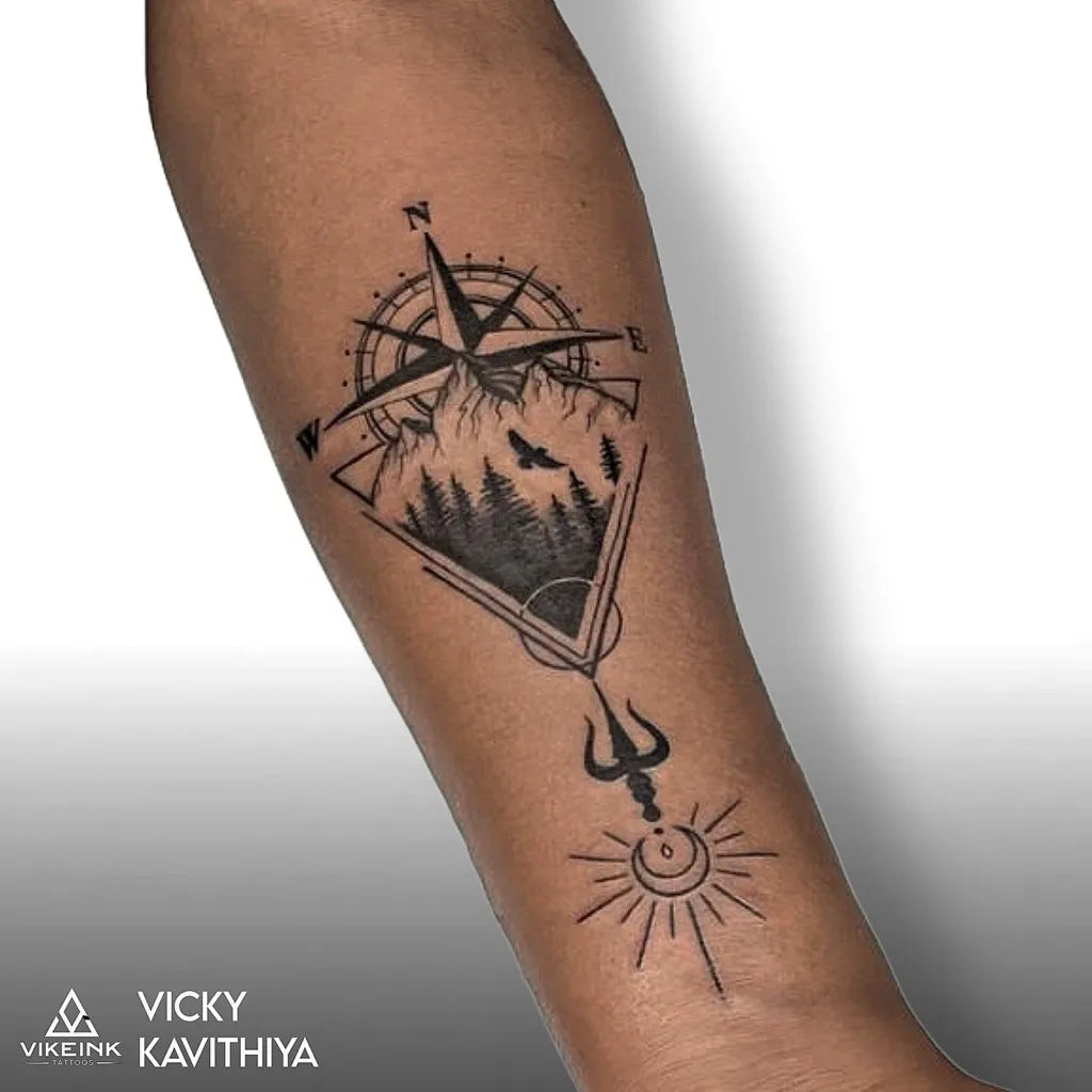 Medium Dotwork Compass Mountains Sun on Men Arm Tattoo by @shivansh_tattoo_piercing