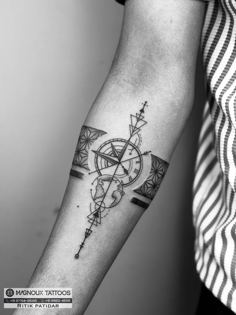 Big Black and Grey Compass Globe Patience on Men Arm Tattoo by @eshanttattoo