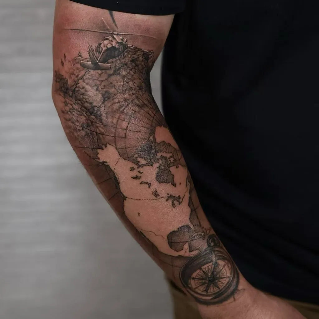 - Upper arm or shoulder: Space for ornaments, florals, or map details.
