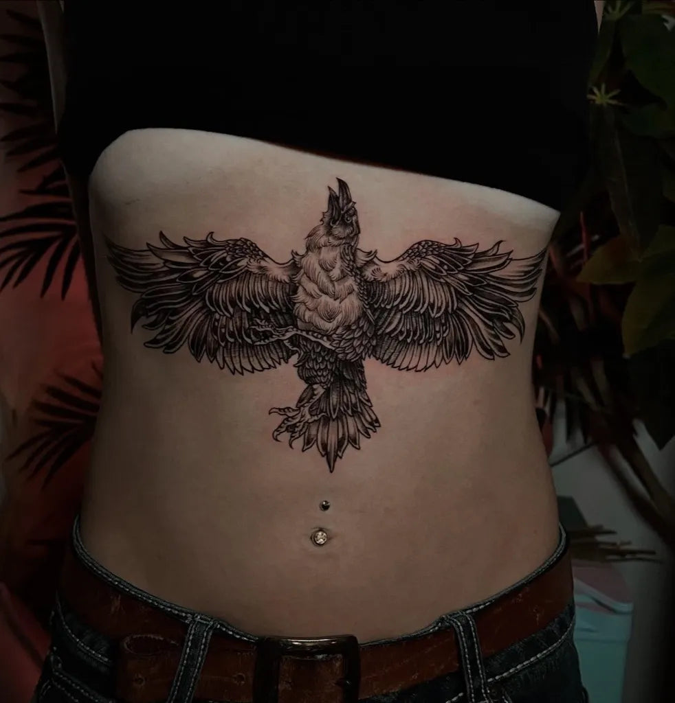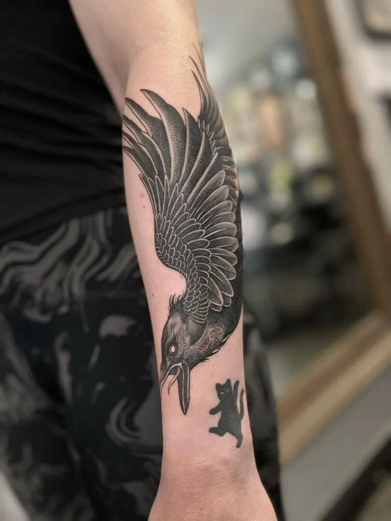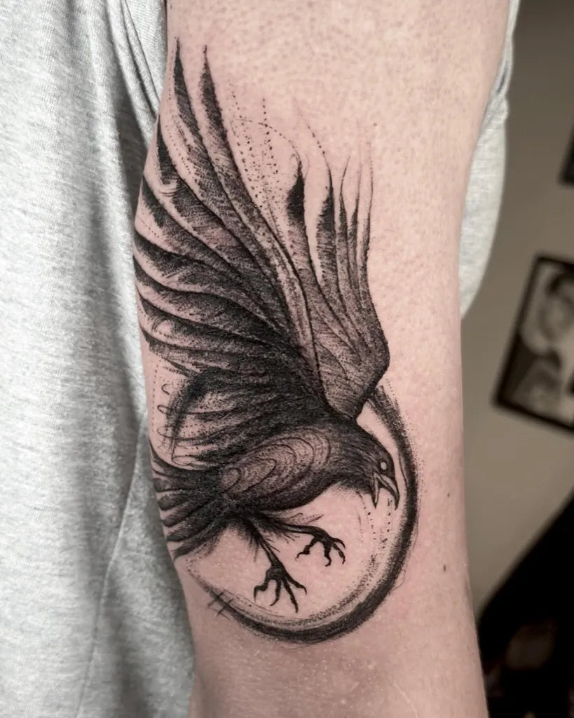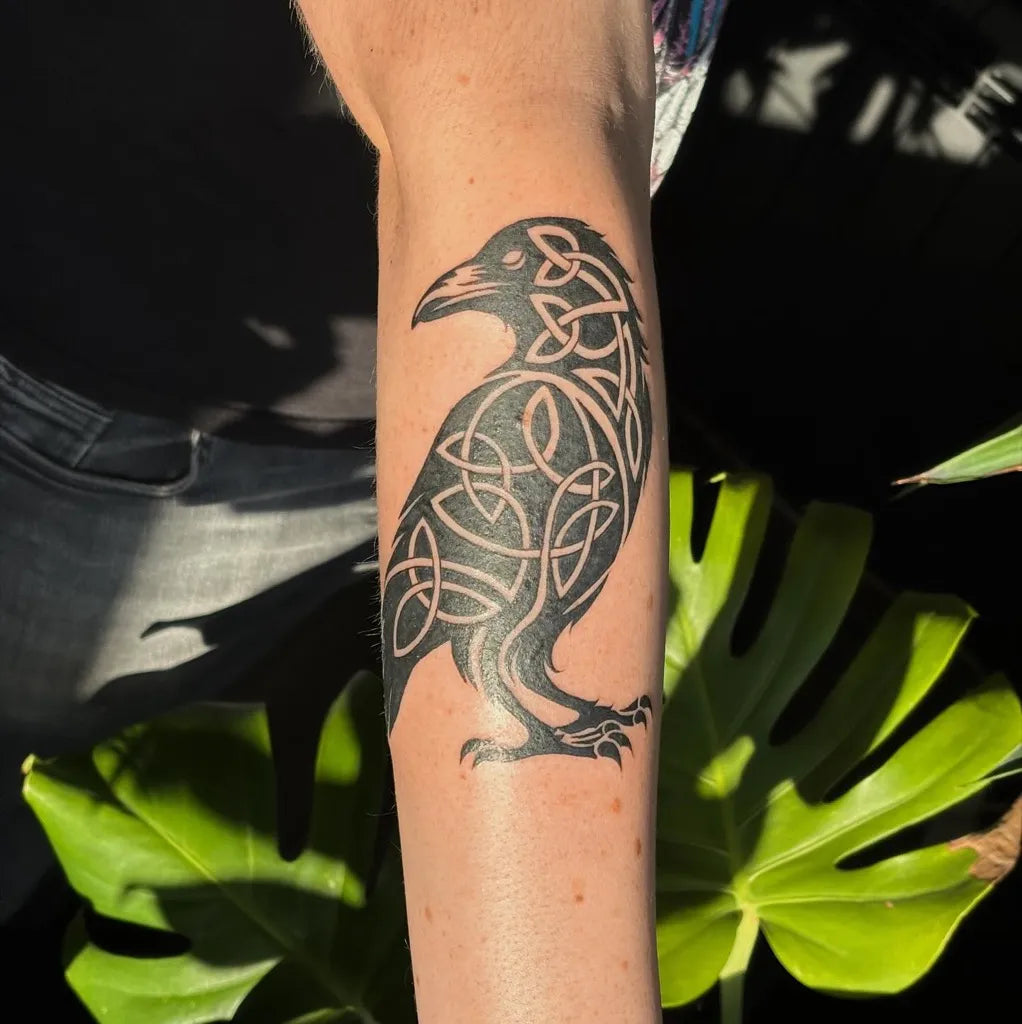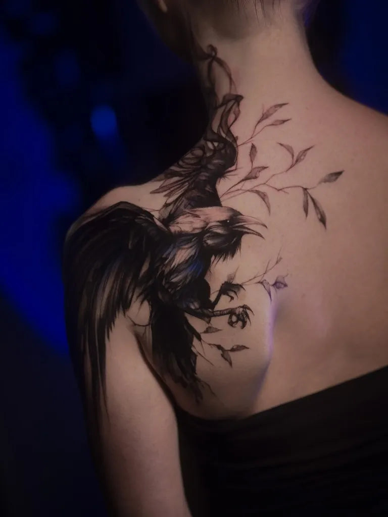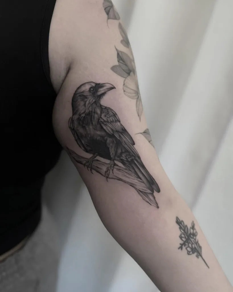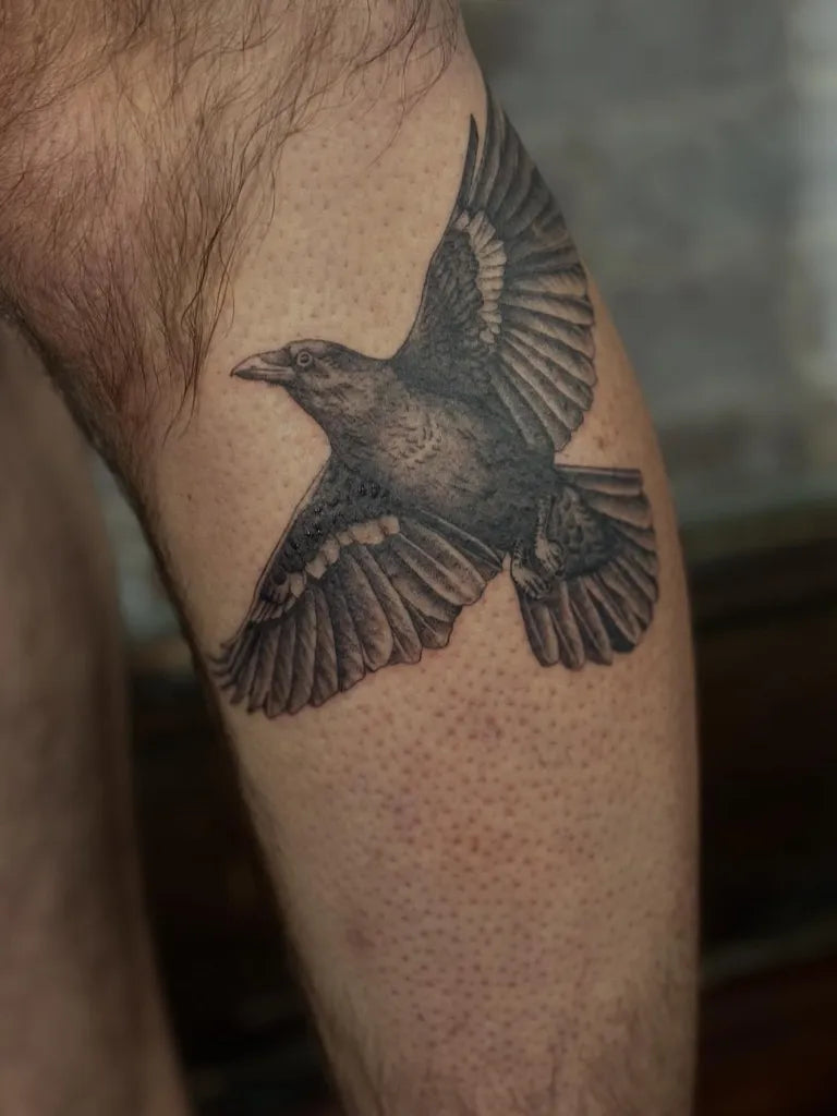 • A crow tattoo symbolizes intelligence, transformation, protection, mystery, and resilience.