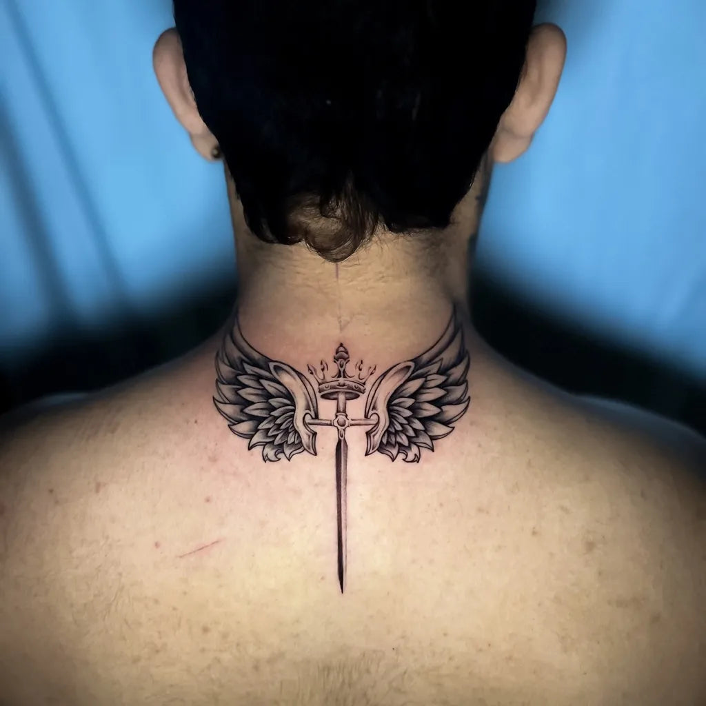 Medium Black and Grey Crowned Sword with Wings Tattoo on Men Nape by @riseinktattoo_and_nailart