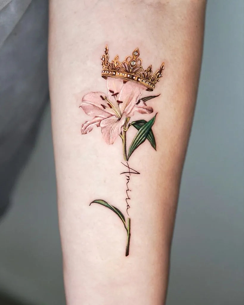 Medium Color Realism Crown Flower Name Tattoo on Women Arm by @xxsummerdaye_