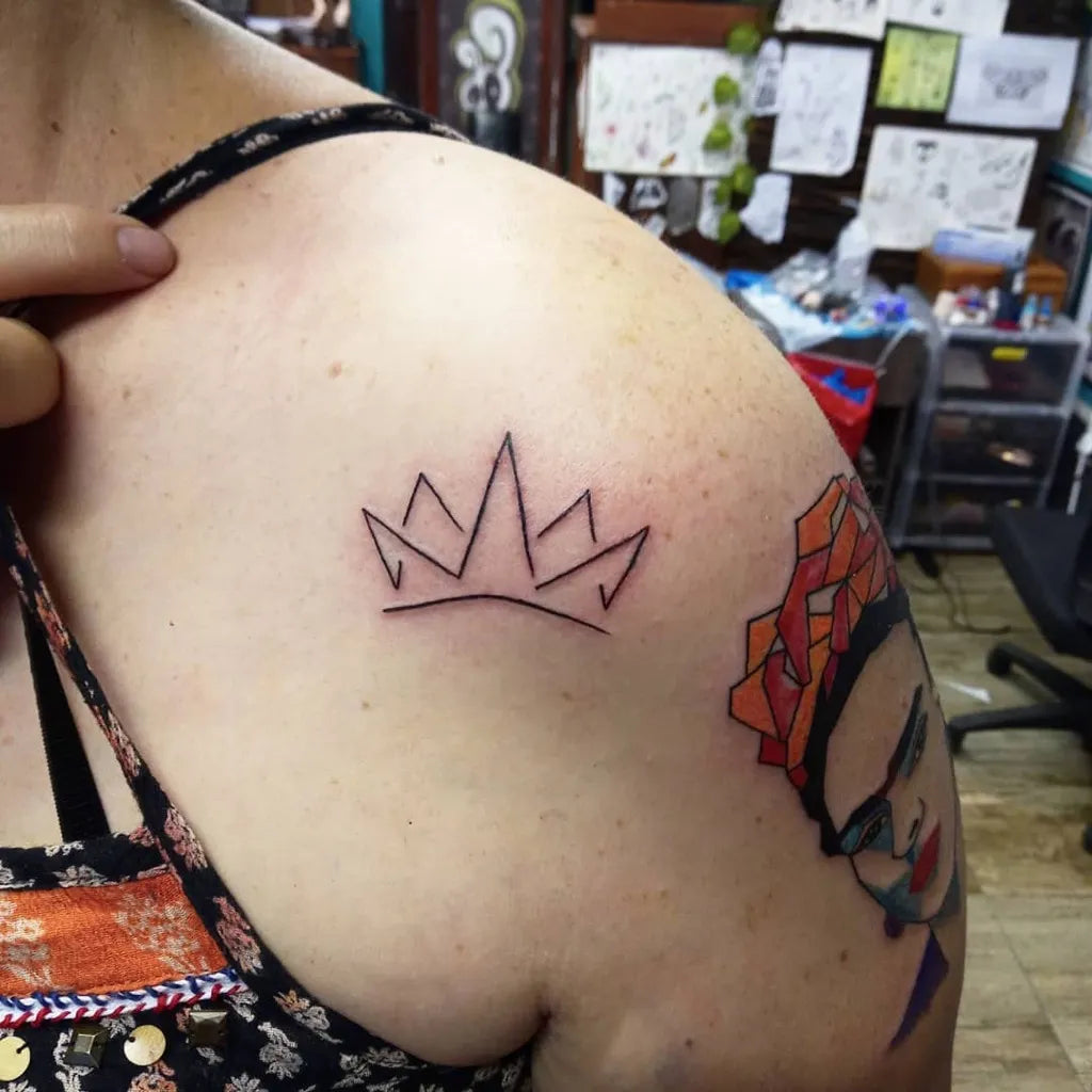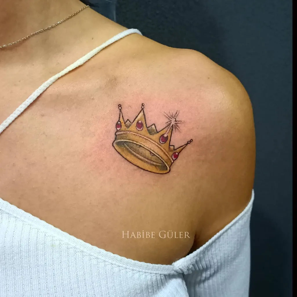 Small New School Crown Tattoo on Women Shoulder by @ha_ink_tattoo