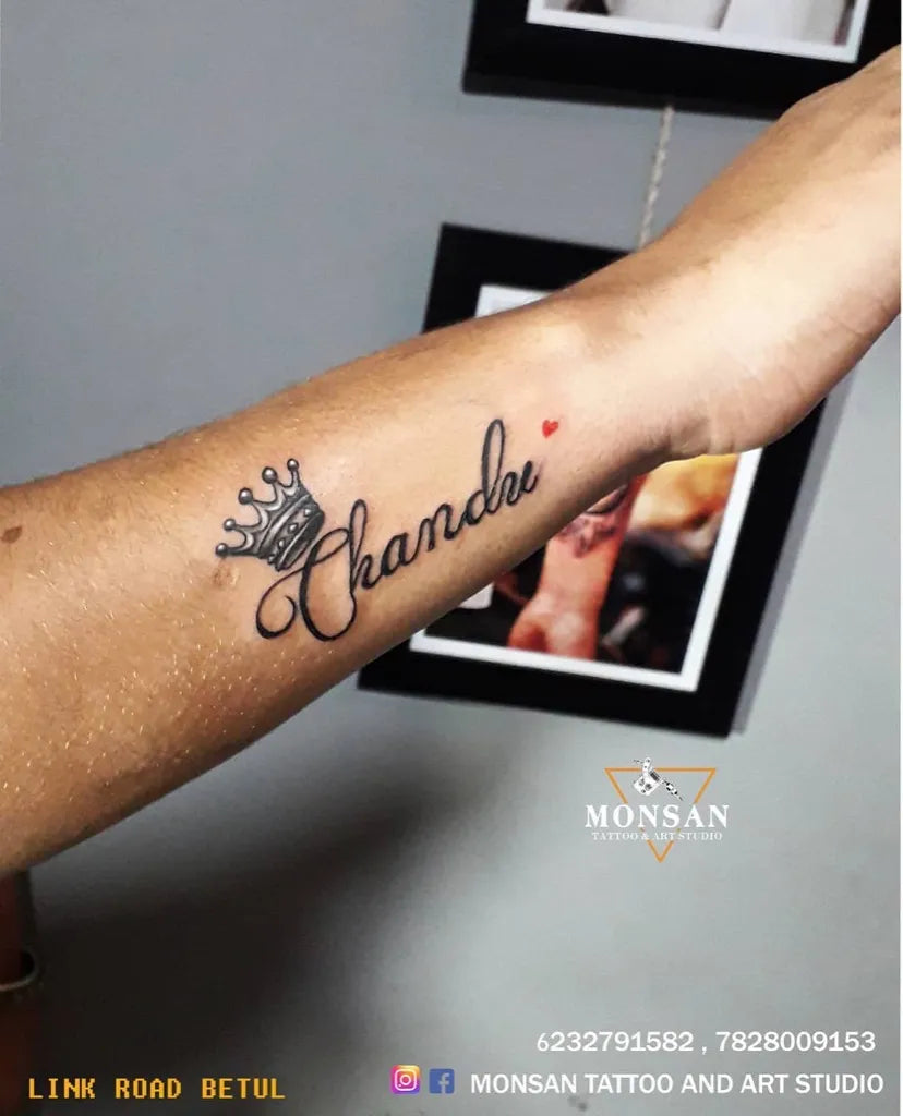 Small Script Crown Name Tattoo on Women Forearm by @monsan_tattoo_betul