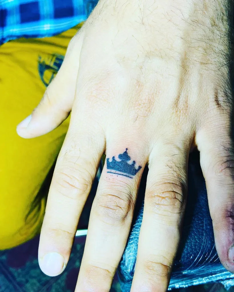Tiny Blackwork Crown Tattoo on Men Finger by @fakeeratattooz