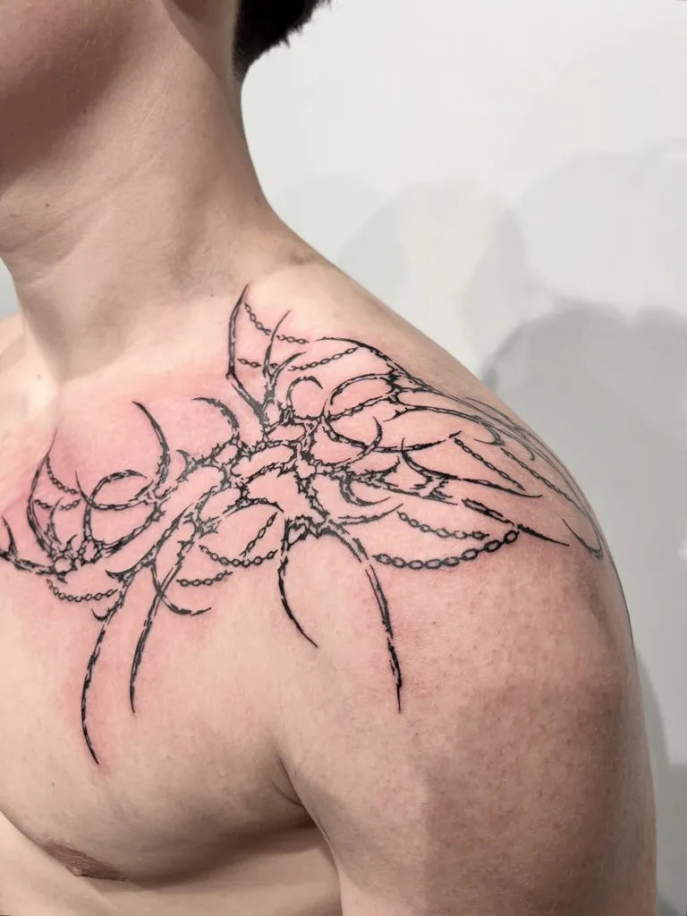 Big Cyber Sigilism Chains on Men Shoulder Tattoo by @blackkattattoo