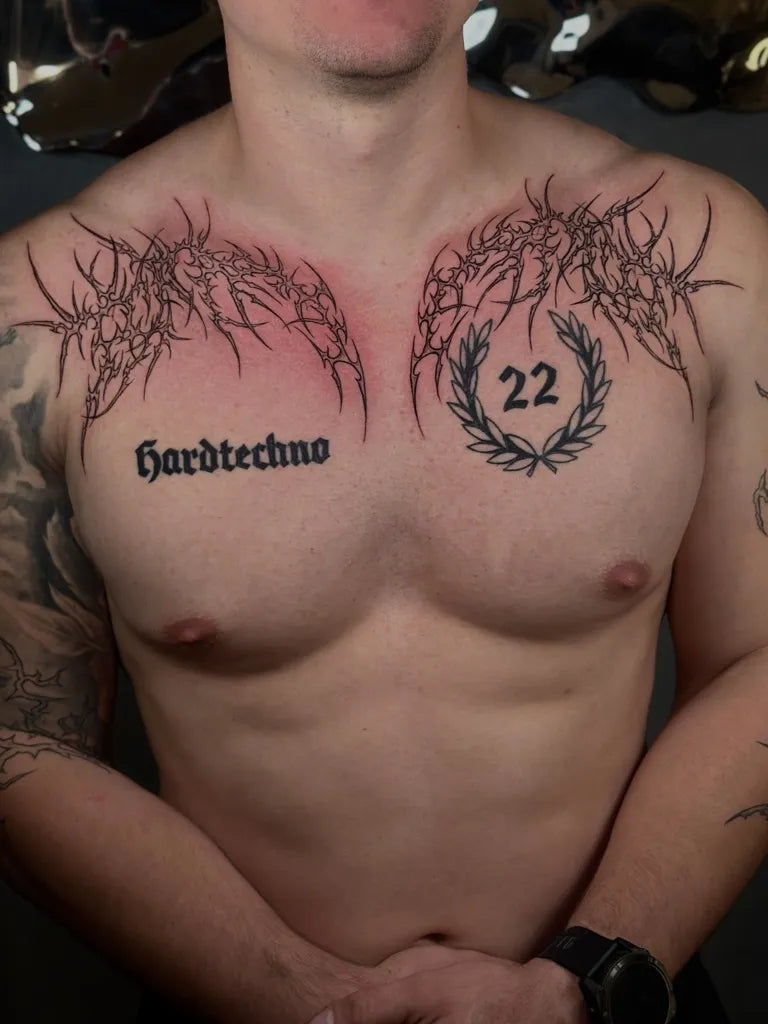 Big Cyber Sigilism Wings with Laurel Wreath and Text on Men Chest Tattoo by @nika_tatts