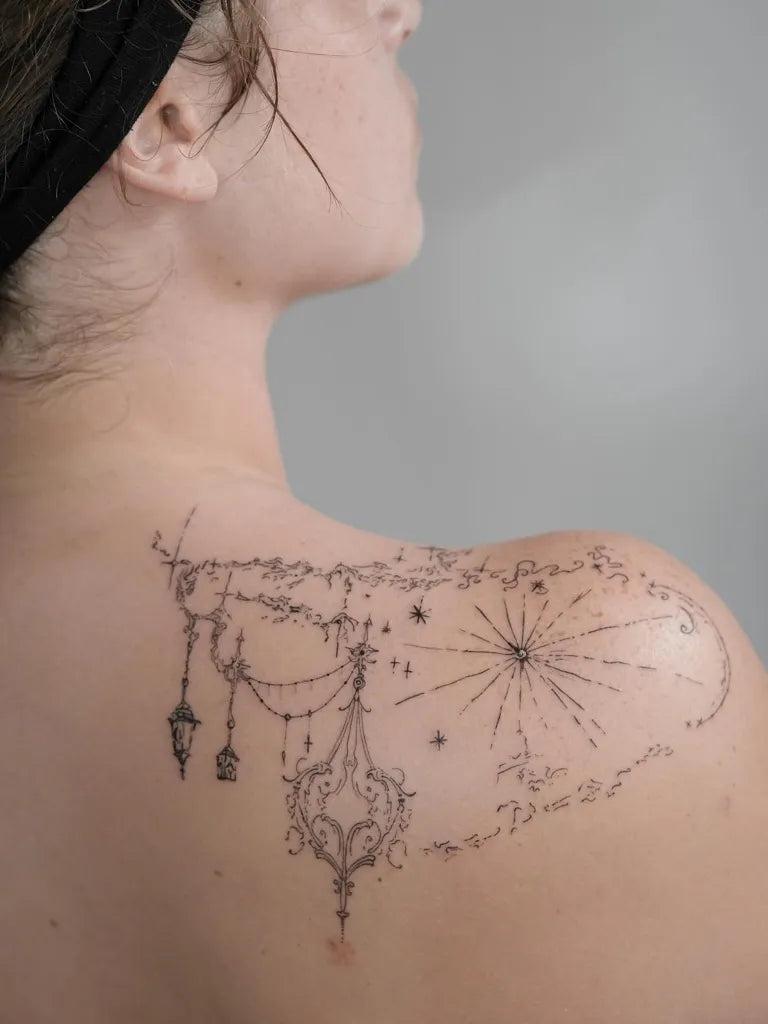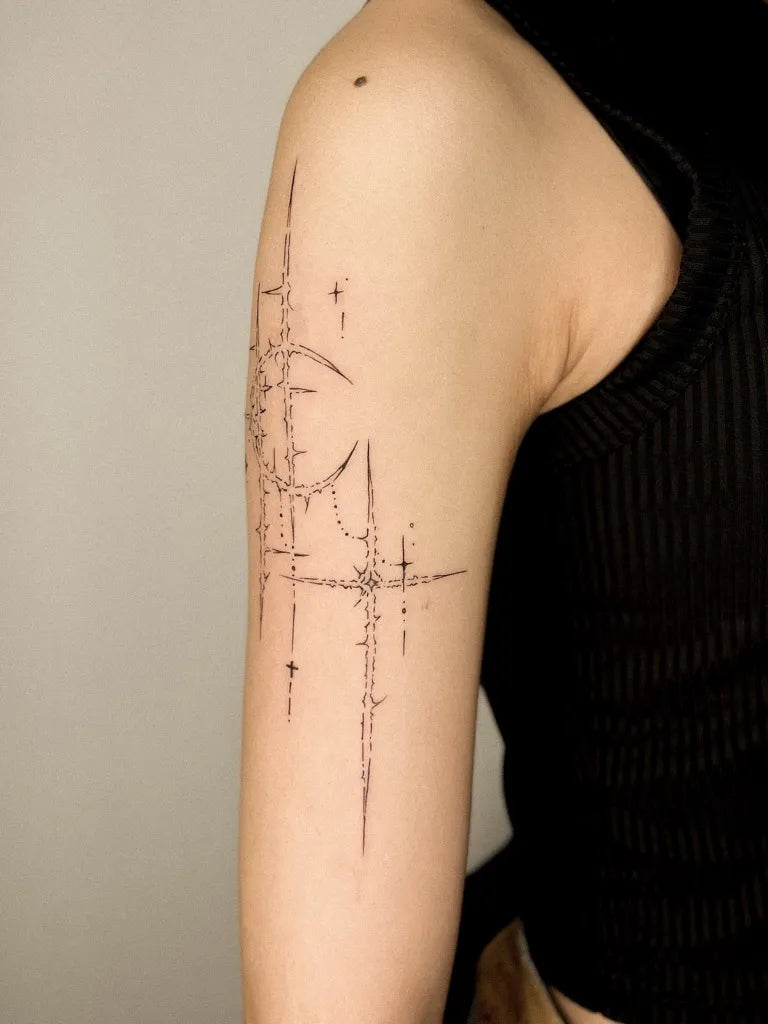 Medium Chandelier Stars Cyber Sigilism on Women Shoulder Tattoo by @thepeople.tattoo