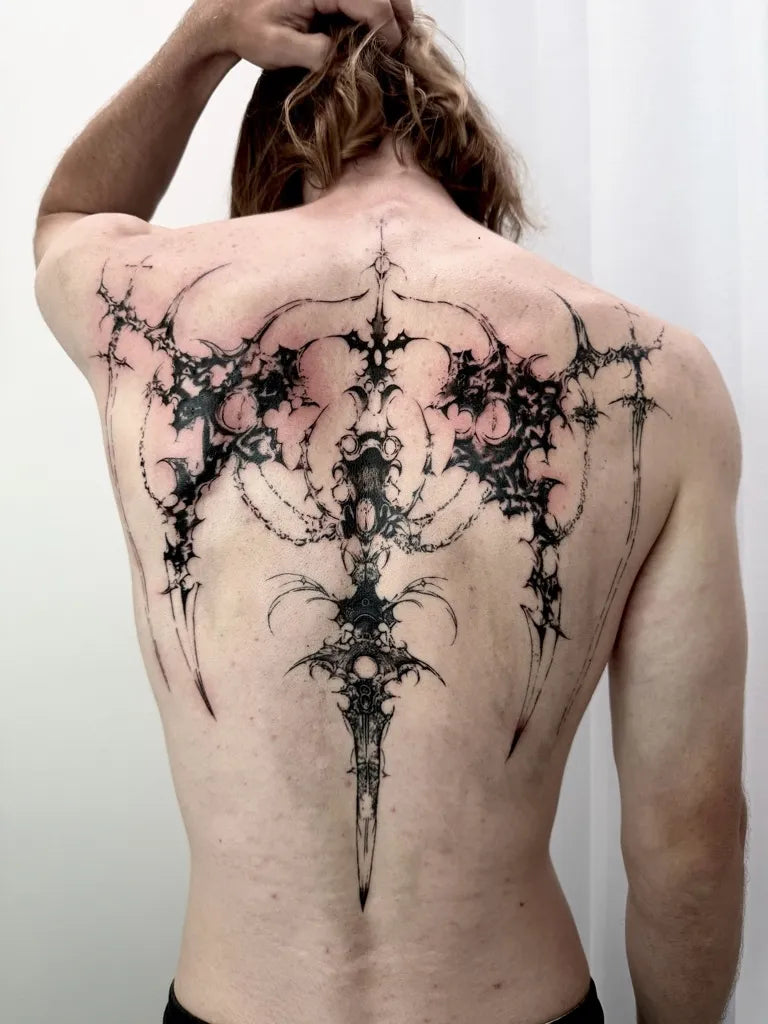 Big Cyber Sigilism and Spine Sigils on Men Back Tattoo by @tattooforest_ed