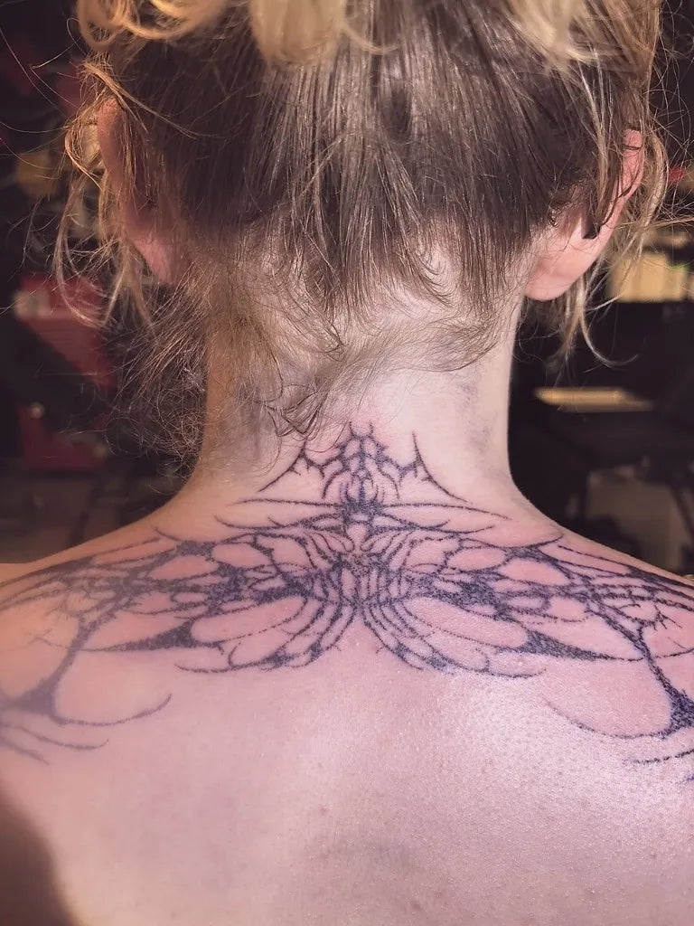 Big Cyber Sigilism Butterfly on Women Back Tattoo by @4littoo