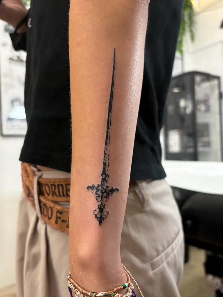Small Cyber Sigilism Sword on Women Arm Tattoo by @taro_tattoo_