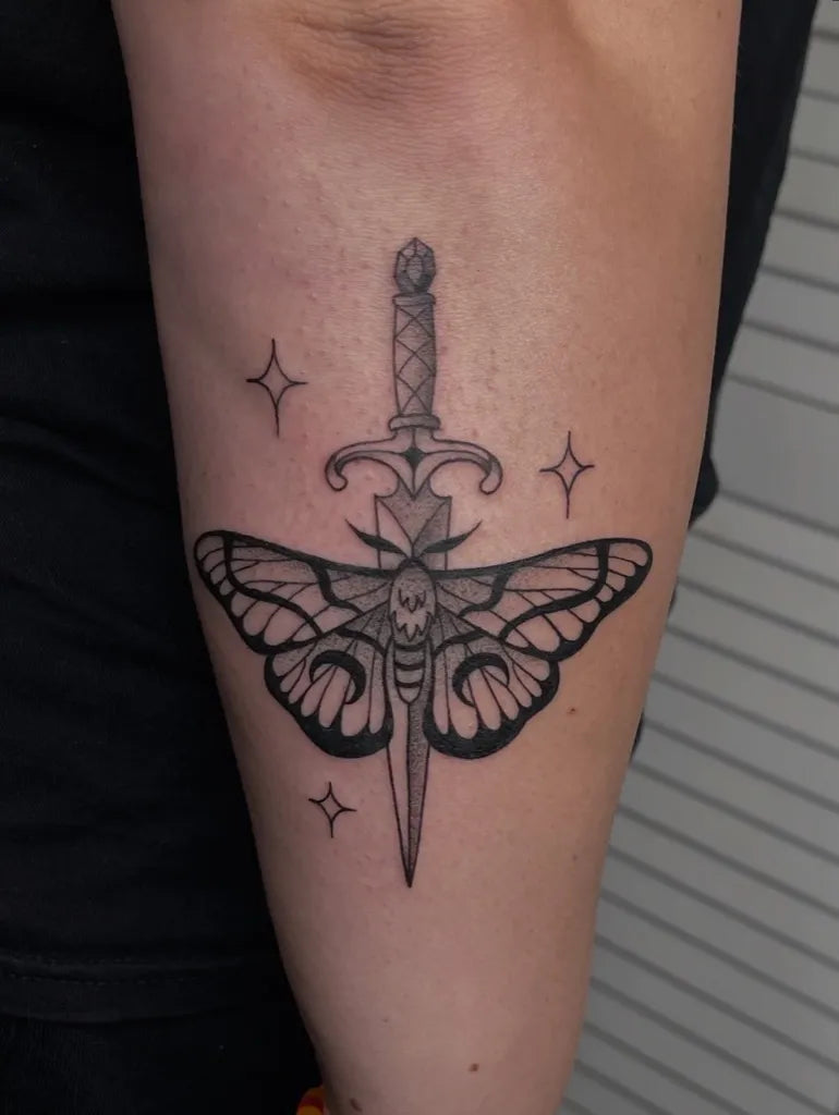 Medium Blackwork Moth and Dagger Tattoo on Women Arm by @the.inked.raven