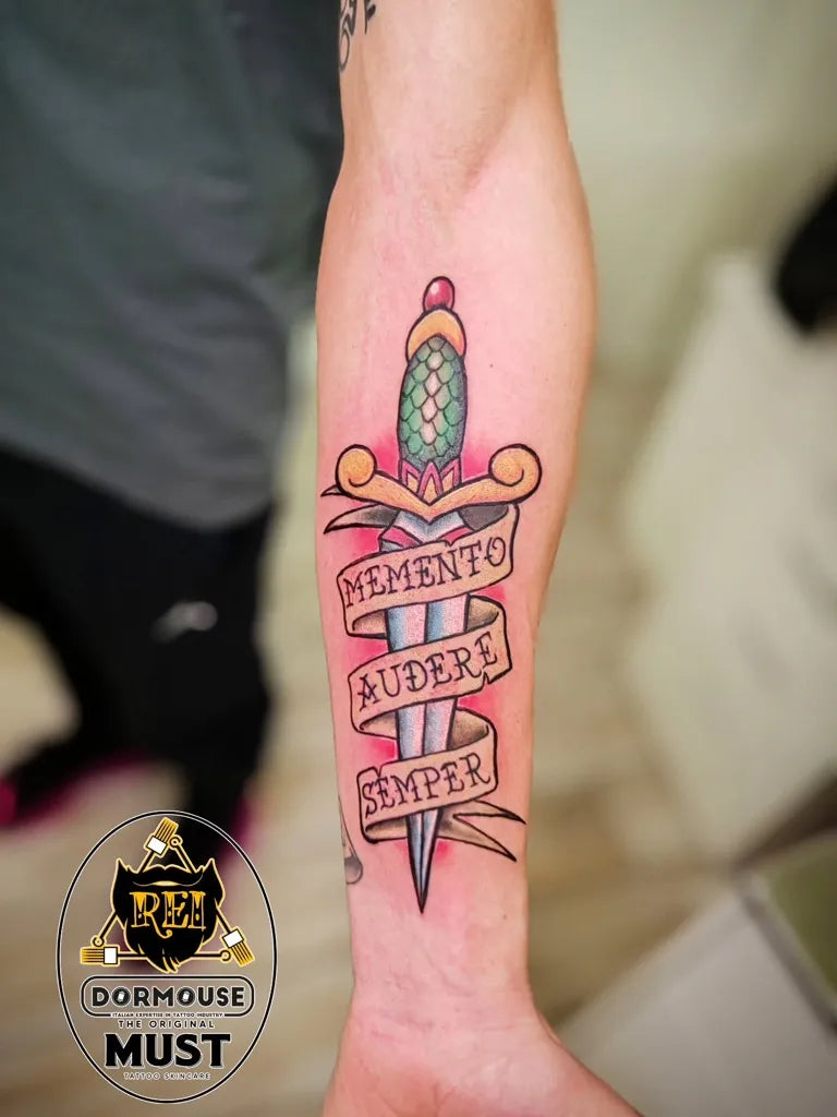 Medium Traditional Dagger Banner Tattoo on Men Arm by @reitattooghemme
